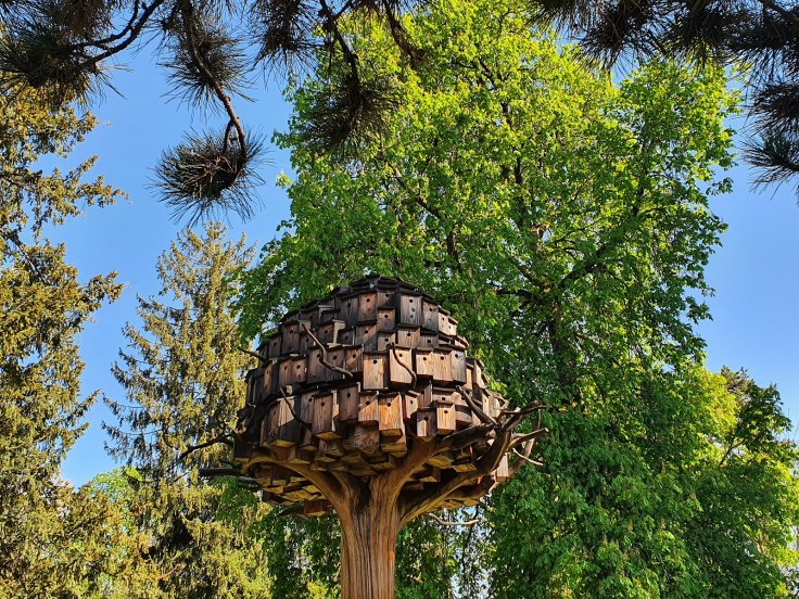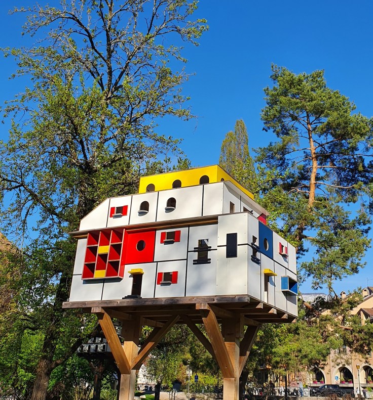 Direction la Haute Savoie pour une balade au bord du lac et dans la ville d’Annecy, pour y découvrir des installations artistiques et paysagères. C’est le festival Annecy Paysages (version 2021, à partir de juillet 2022 il y aura d’autres installations). Nous l’avons découvert par hasard en passant dans les jardins de l’Europe. Je suis d’abord tombée sur ce logement collectif pour oiseaux : Implantations, une oeuvre de Bob Verschueren.