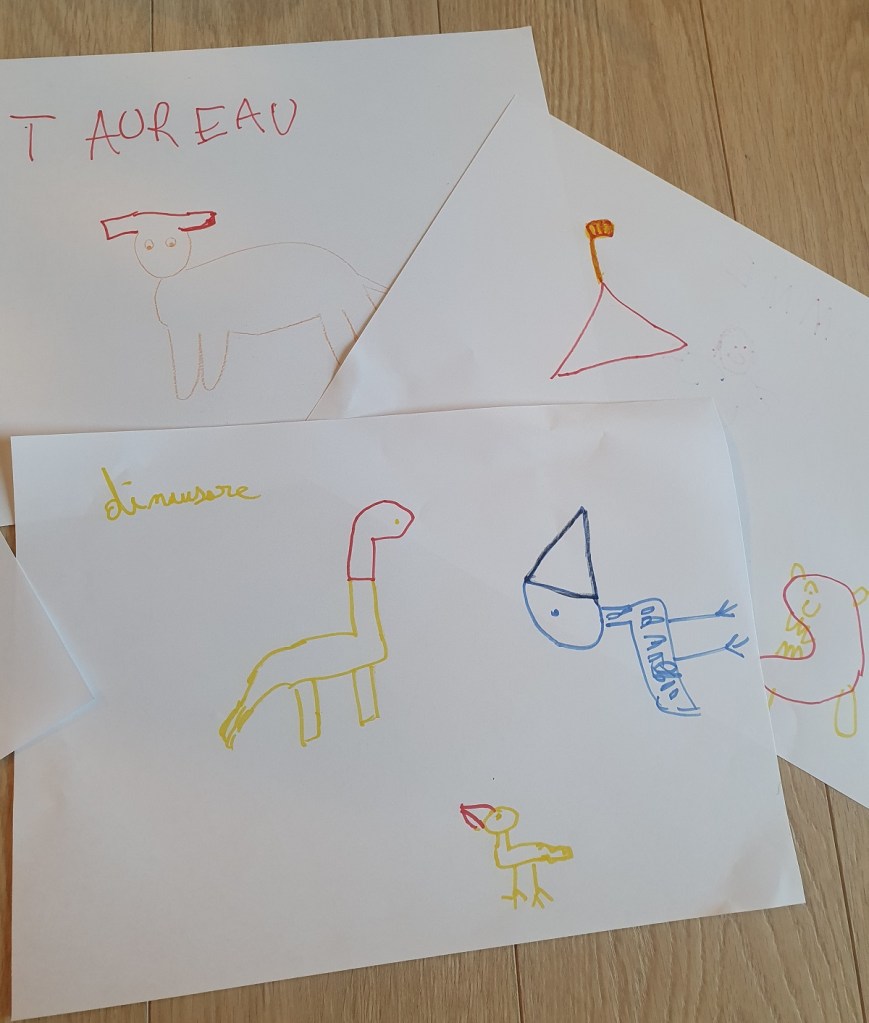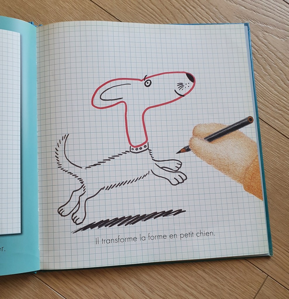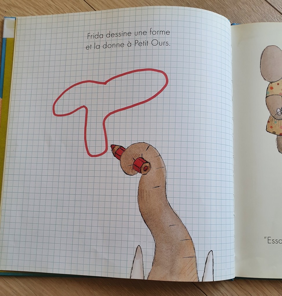 Tout deux adorent dessiner, mais Petit Ours n’a pas d’inspiration. Frida dessine donc une forme sur une feuille blanche et l’invite à la compléter. Cela devient un chien. A son tour Petit Ours propose le même jeu à Frida. Et à notre tour, nous avons avons joué au jeu des formes. Je vous montre quelques pages du livre et puis nos dessins co-imaginés. Et si vous aimez l’idée, faites comme Frida et Petit Ours 🙂 Alors, qu’avez-vous dessiné ?