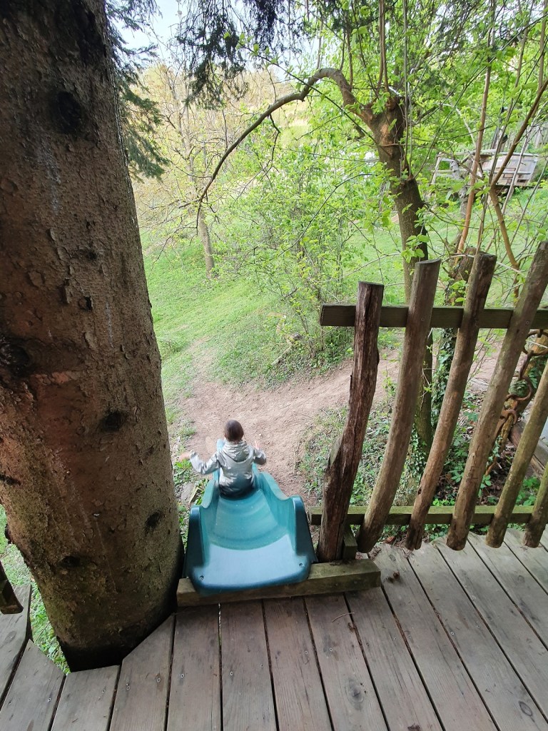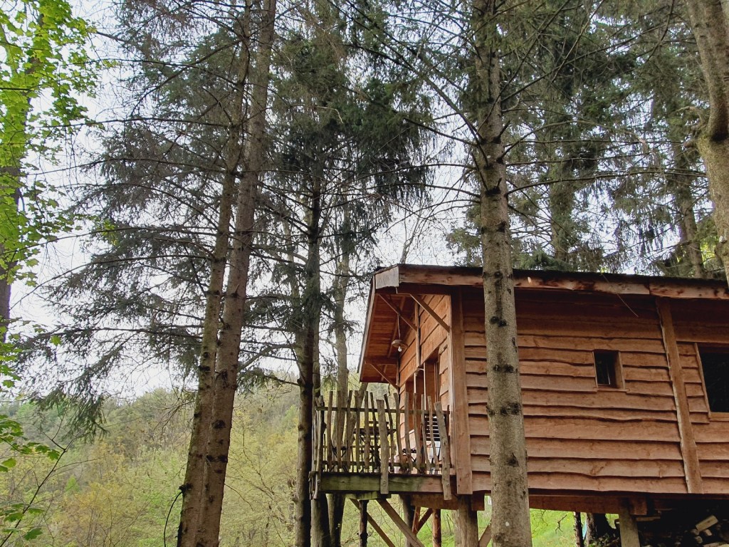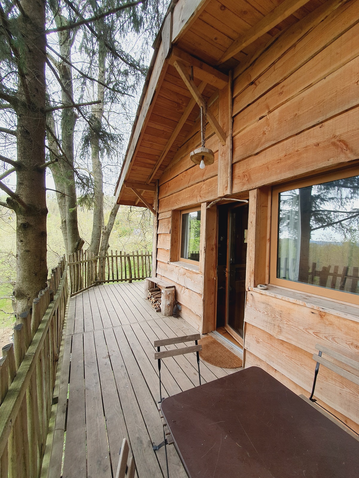La version dans l’arbre, avec échelle ou baudrier pour y grimper, est réservé aux adultes et enfants plus grands. Tandis que la cabane dans laquelle nous avons dormi était en partie sur pilotis. De la terrasse, nous avions l’impression d’être suspendus dans les sapins.