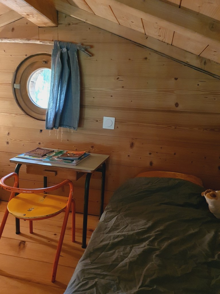C’est ce qui a beaucoup plus aux enfants : cette mezzanine avec sa fenêtre ronde, son petit bureau… Mais aussi elles ont adoré le toboggan pour descendre de la terrasse et profiter du jardin.