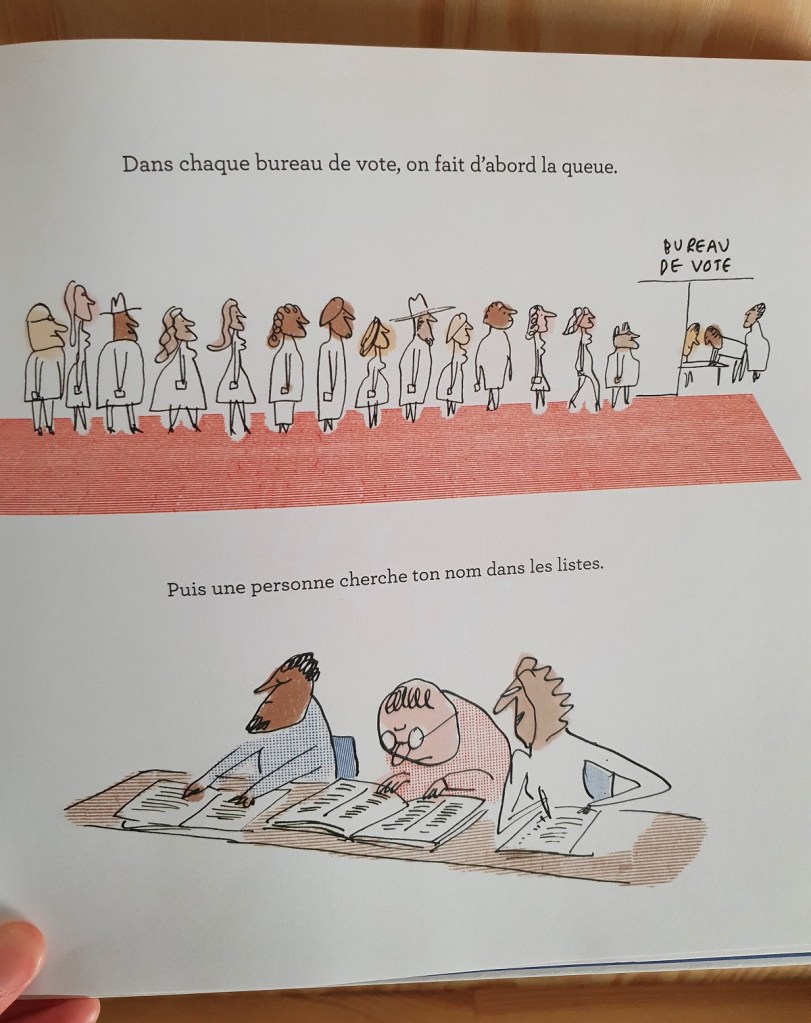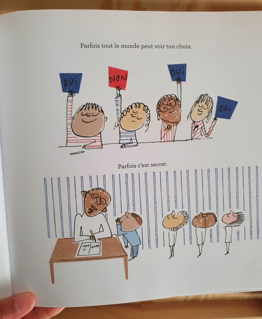 Puis, le livre explique comment se passe les élections dans le monde des adultes, de façon très simple. Il n’est pas abordé d’orientations politiques, l’auteur a préféré imaginé des mesures qui parleraient aux enfants, même si peu probables. Les jour du vote est aussi détaillée avec toutes les étapes au bureau de vote. Le livre se termine avec une partie plus documentaire, adapté aux plus grands, expliquant les différentes élections en France.