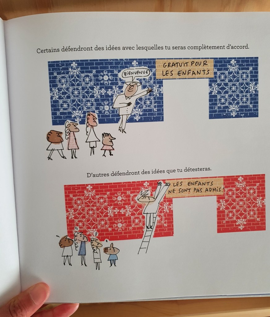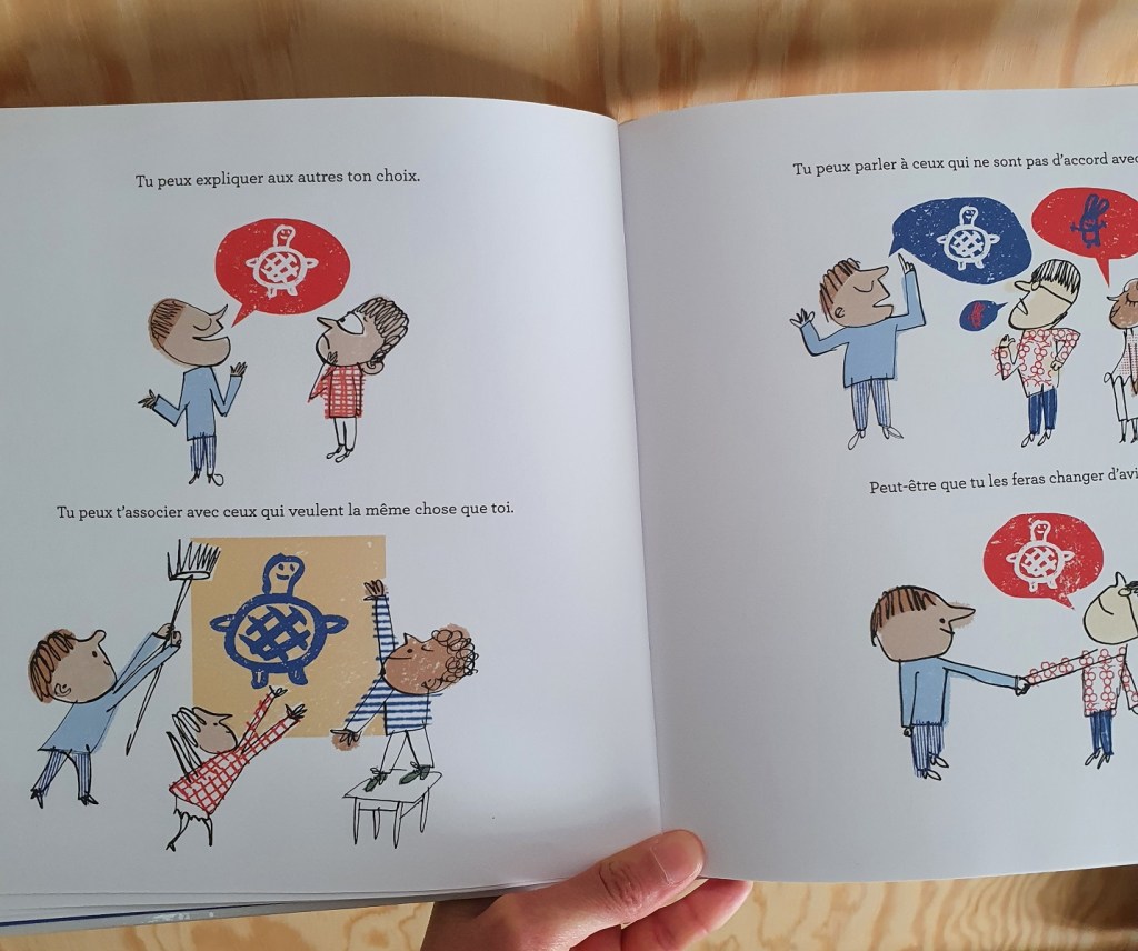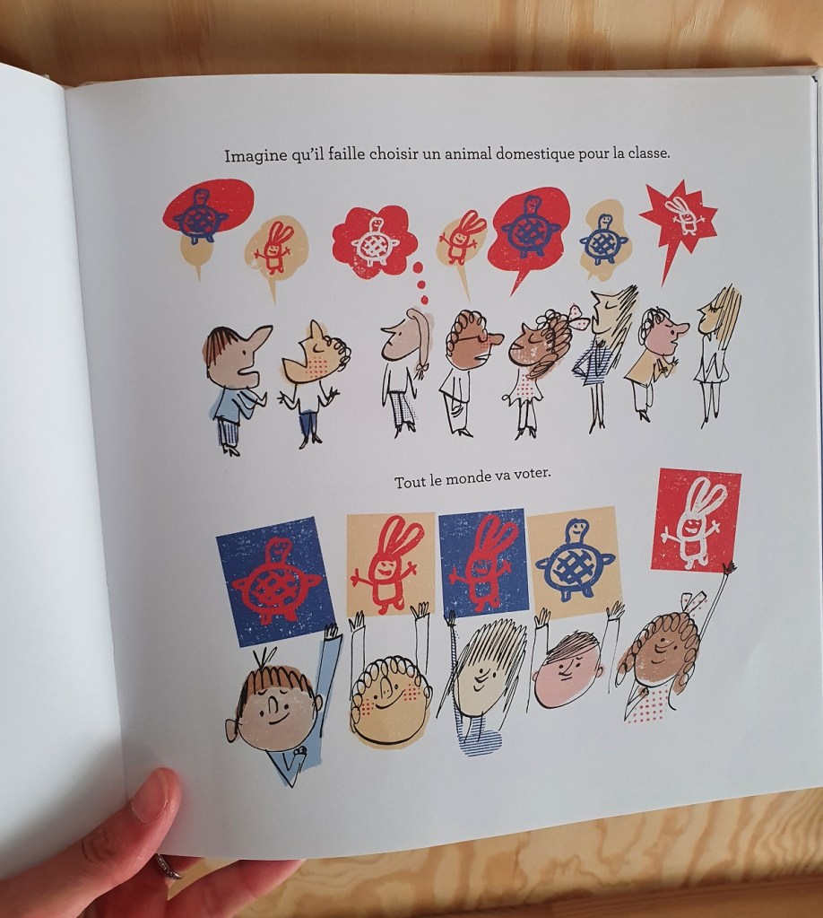 C’est un livre très bien fait pour expliquer aux enfants (d’école primaire) le principe des élections : les candidats, le programme, la campagne, les opinions et le vote. Cela commence par l’exemple d’une classe d’école qui doit choisir un animal de compagnie. Chacun a son opinion, mais peut-être ensuite influencé par ses camarades de classe, et à la fin on vote : tortue ou lapin ?