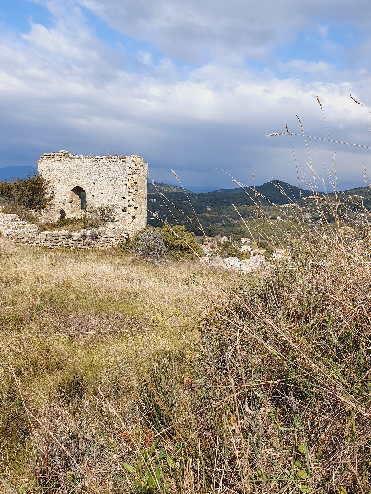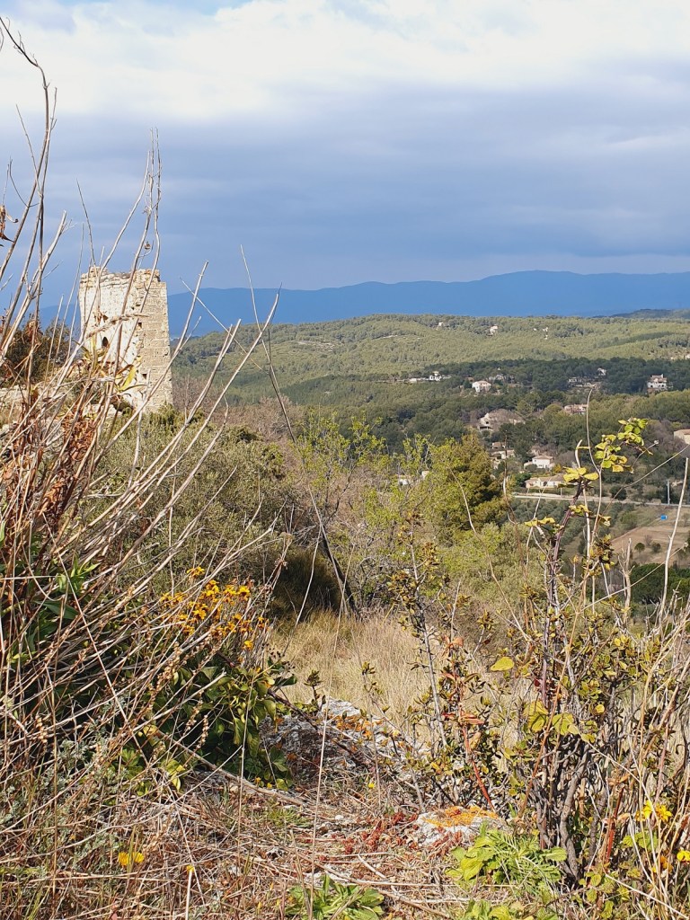 Le plateau du Foussa a été habité dès le Moyen-Age. Une citadelle y fut contruite, protégée par des remparts. Des habitations troglodytiques ont été creusées ans la colline et habitées jusqu’au tremblement de terre de 1909. La balade part du centre du village, de la rue du Cégarès. Nous avons grimpé jusqu’à la fenêtre du Foussa en passant par le champ d’oliviers par la gauche. Nous avons pu voir plusieurs ruines d’anciennes maisons, des traces dans la roche de constructions troglodytiques. Une fois sur le plateau, nous avions une vue de tout le village, la Trévaresse, la vallée Durance et le Luberon au loin. Nous sommes redescendus par un chemin plus rapide, derrière le gros rocher qui supportait autrefois une tour.