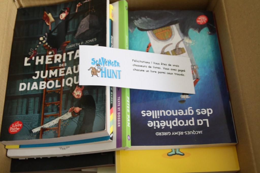 Suite à la présentation des romans Chasseurs de livres (enfin, du premier tome), voici la chasse aux trésors façon Book Scavenger imaginée pour l’anniversaire de l’aînée (11 ans). Déjà, pour une chasse aux livres, il faut des livres. Ce n’est pas ce qui manque à la maison, mais nous nous sommes dit que cela pourrait être sympa que chaque invitée reparte avec un livre. Ça aurait pu être un des tomes de Chasseurs de livres, mais nous n’y avons pensé qu’a posteriori. Il fallait des livres pour les énigmes et des livres pour le trésor final. Et suffisament de choix pour que chacune trouve un livre qui lui plaise. J’ai écumé les boîtes à livres (ceux non choisis à l’anniversaire y sont retournés), trouvé des livres d’occasion et des livres que nous avions en double.
