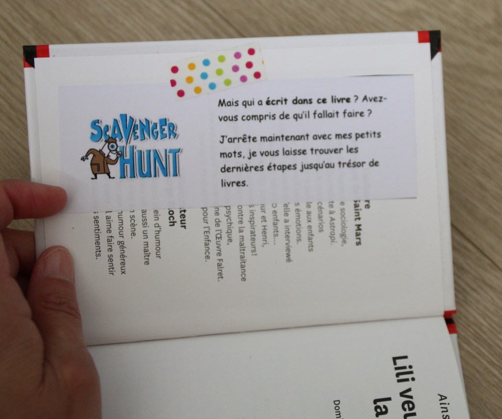 Il y avait dans le livre, une page du roman présentée différemment sur laquelle était indiquée 3 mètres. Mais elles ont trouvé le chiffre 80 dans une autre page, elles sont parties sur l’idée de chercher dans un rayon de 80 mètres… dans le jardin. Il a fallu les aider un peu, pour qu’elles ne passent pas au peigne fin tout le quartier !