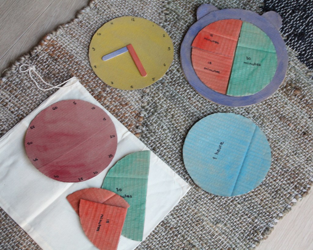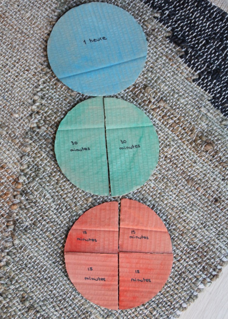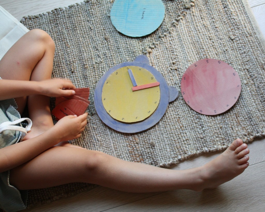 Quand des cartons deviennent un réveil pour apprendre à lire l’heure et découvrir les heures et les minutes… C’est le bricolage rapide qui necessite un peu de découpage et de peinture pour réaliser 5 ronds en carton :