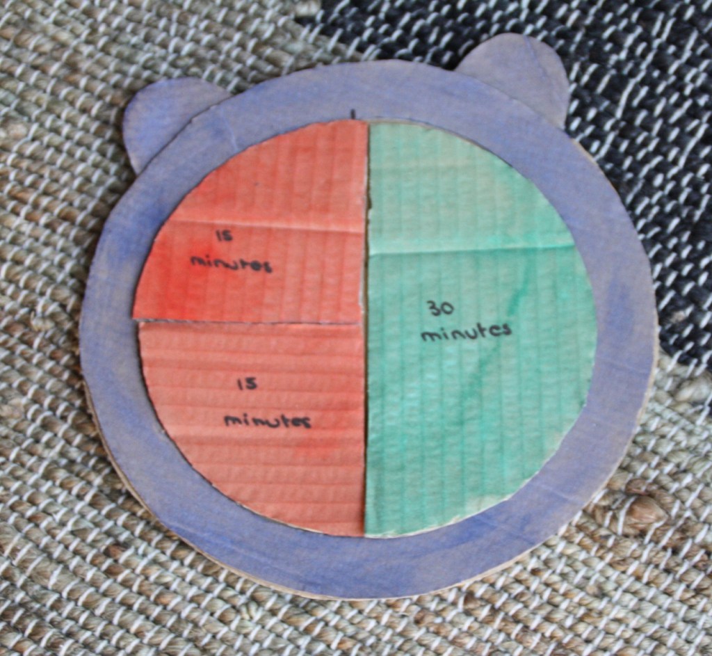 J’ai aussi fait un support façon réveil pour y insérer les ronds et deux aiguilles en batonnets de bois (j’ajouterais sûrement des aimants).