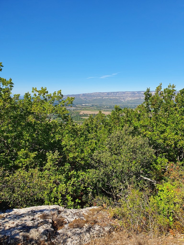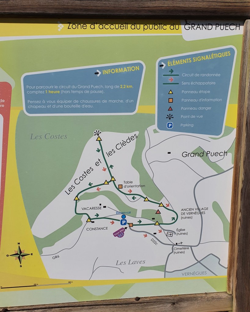 Enfin, il y a au moins trois balades possibles plus ou plus longues. Il y a d’abord celle du guide Le P’tit Crapahut (qui part d’Alleins et fait 7 km), celle de l’application Komoot (qui part d’un parking en haut du village de Vernègues, près du réservoir et fait 5,5 km) et celle proposée par la commune et indiquée sur ce panneau (même parking de départ et la distance est de 2,2 km). Nous étions partis pour faire la deuxième balade, mais la pause pique-nique et la découverte de caches de géocaching nous ont fait opté pour le plus court trajet.