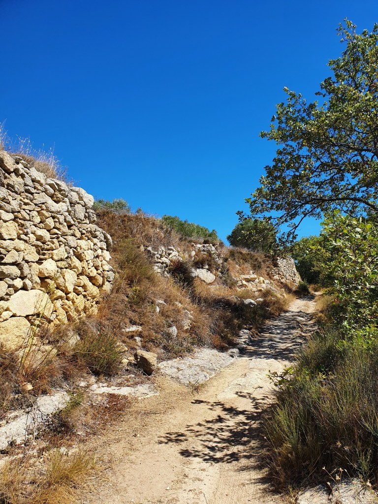 La promenade est facile, sur un sentier bien large, avec peu de dénivelé. On alterne passage en forêt, chemin ensoleillé au bord de murs de pierres sèches, plateau avec un panorama sur tous les environs et découverte des ruines de l’ancien village avec un château, une église et d’anciennes maisons.