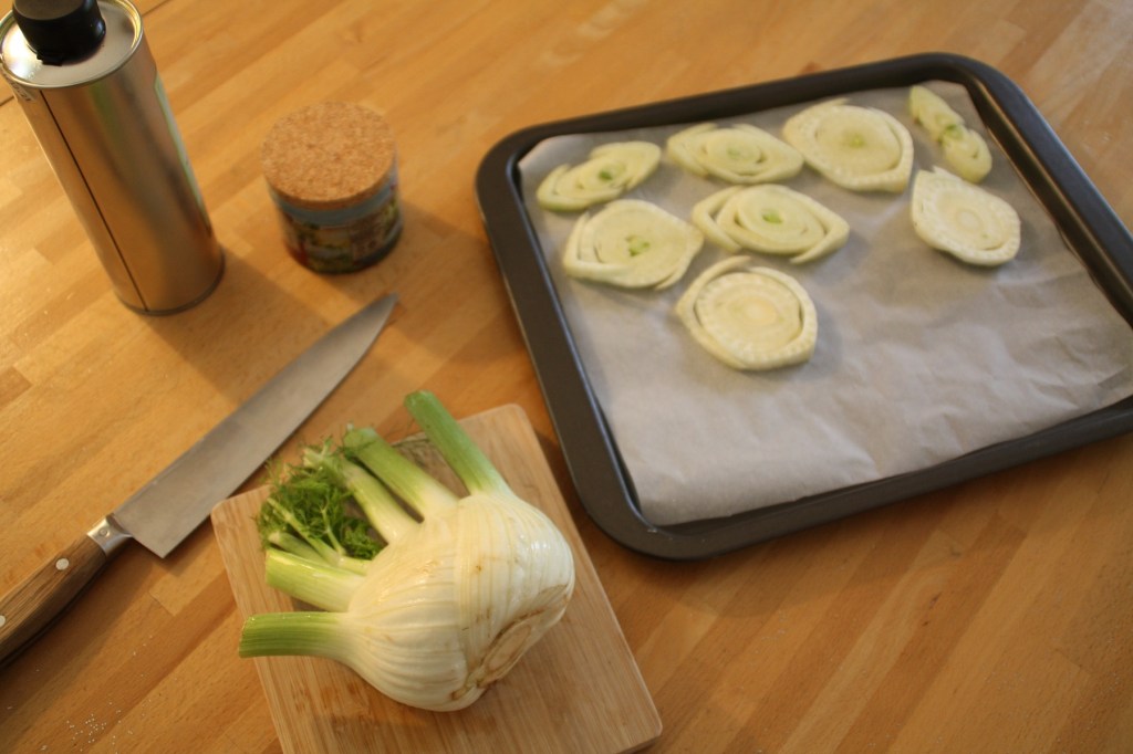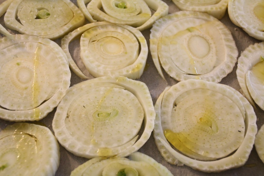 Faites préchauffer le four à 210°C. Coupez les bulbes de fenouil en tranches d’1 cm d’épaisseur environ. Posez-les sur une plaque et du papier sulfurisé. Versez un filet d’huile d’olive. Ajoutez un peu de fleur de sel. Faites cuire 20 minutes au four.