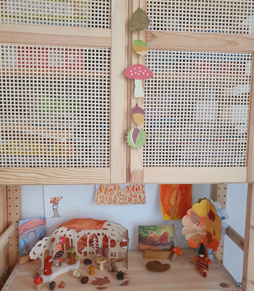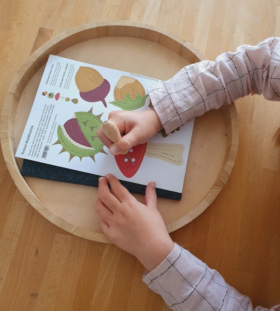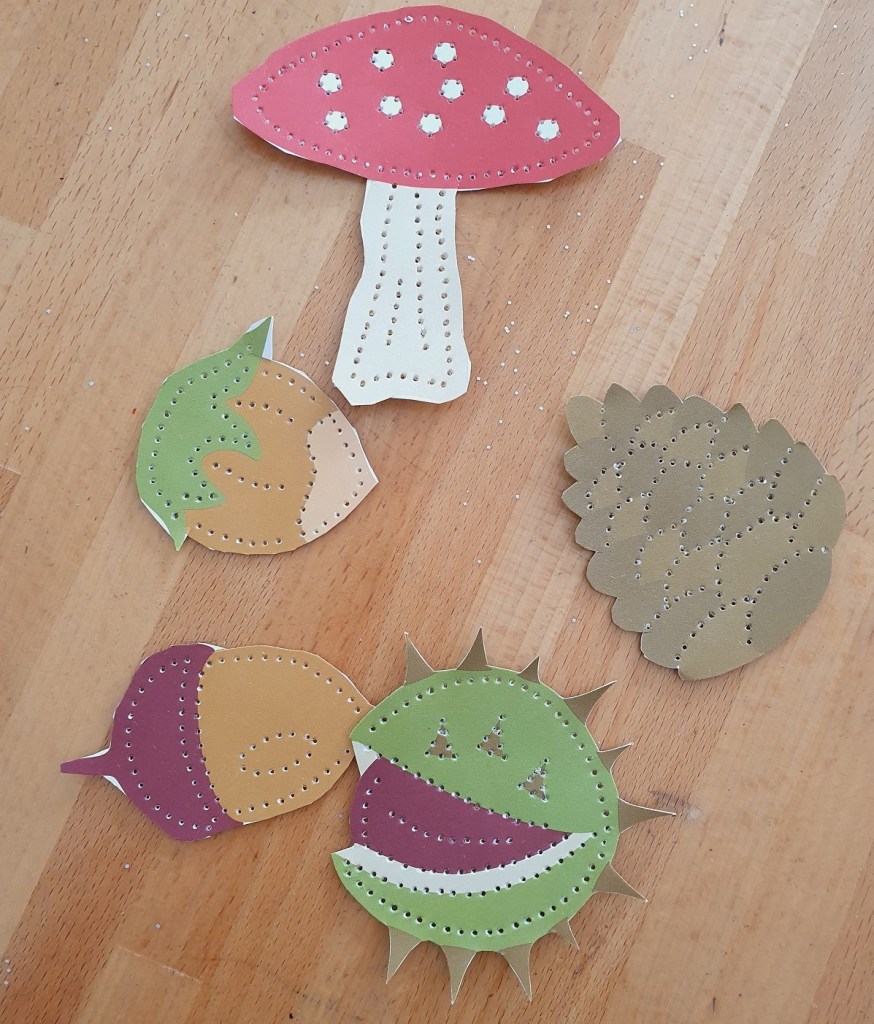 C’est amusant de faire des petits trous dans ces fruits de la forêt en papier cartonné (c’est la marque allemande Familienmomente qui propose cela). Un peu long quand même (j’ai fait les derniers trous). Mais c’est un bon exercice de motricité fine et, après découpage, cela fait une jolie guirlande pour exposer au dessus de la table des saisons.