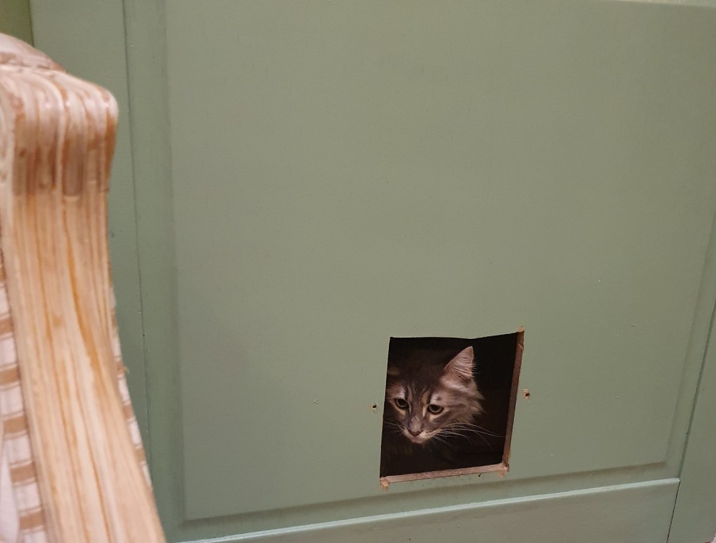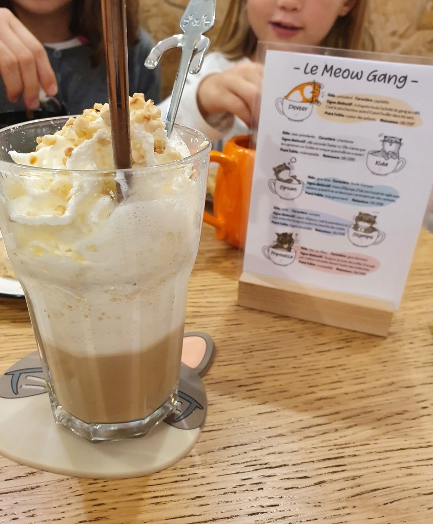 Au Meow Cats Café, c’est le domaine des chats. Au dessus des tables, passelles et étagères sont leurs refuges pour dormir. A moins qu’ils ne préfèrent se mêler aux visiteurs et prendre place sur une chaise. Nous y sommes allés pour le goûter : boissons chaudes et cookies. Vous pouvez aussi y prendre le brunch le samedi. Fripouille nous a tenu compagnie. Il paraît que c’est le tir-au-flanc du Meow Gang. Le lieu est réservé aux 6 ans et plus.