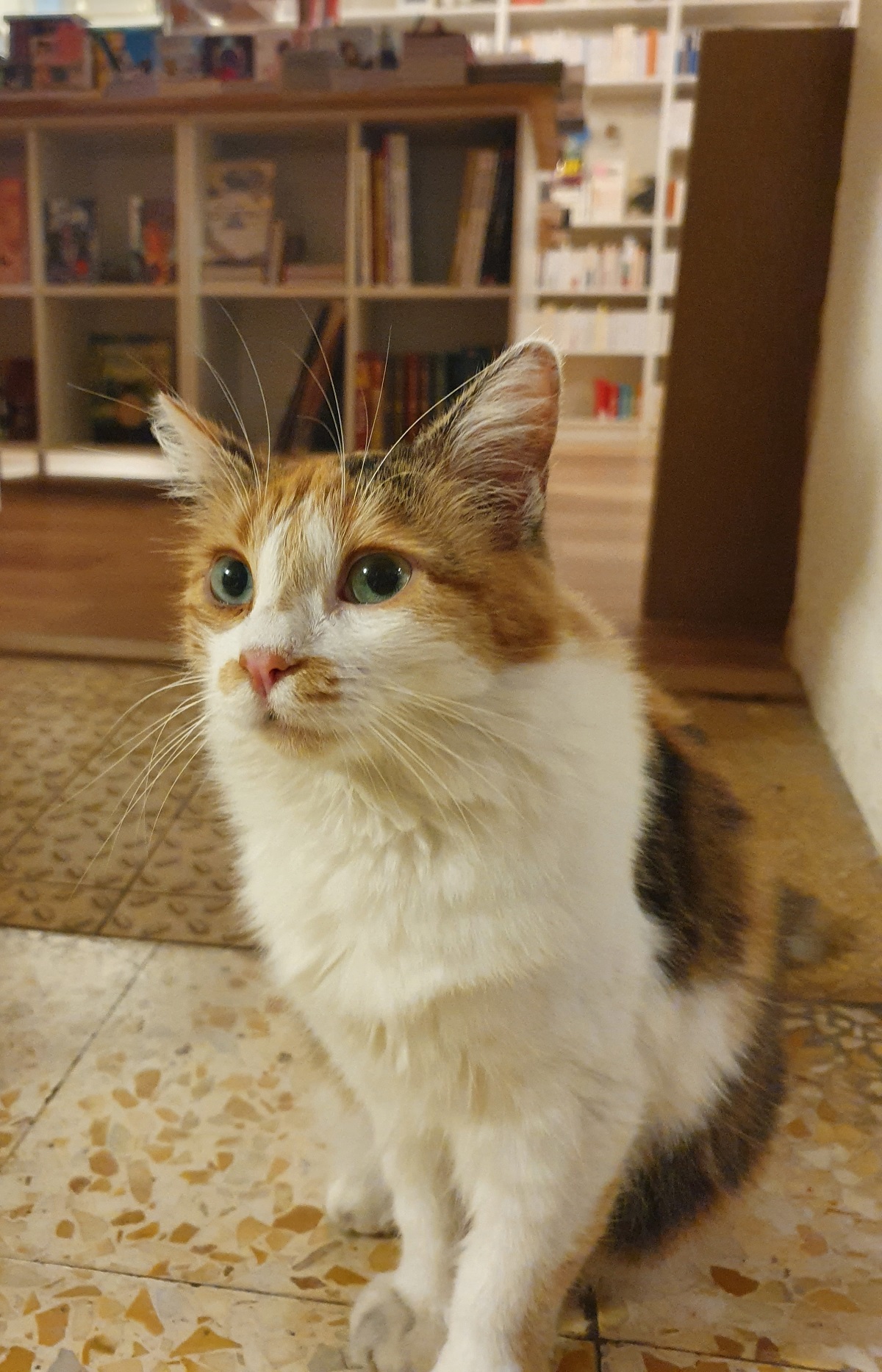 Et puis direction Mon Chat Pitre, la première librairie de France à accueillir des chats. Au début, ils étaient de l’autre côté de la chatière (peut-être l’heure des croquettes). Et puis, nous avons aperçu Garfield en pleine sieste sur un fauteuil, Plume pas très loin des mangas Plum ;), Tam assistant à la caisse et Colette qui voulait des câlins. C’est une librairie généraliste avec un joli coin littérature jeunesse. Bien sûr, nous y avons retrouvé les livres préférés des filles avec des chats pour héros… mais pas que !