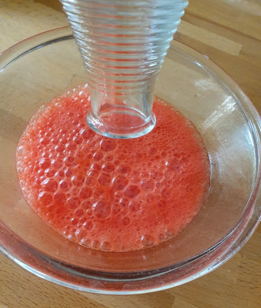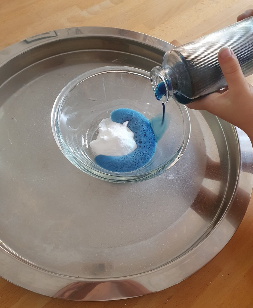 Attention Ă la rĂ©action si vous versez un peu du liquide de ce flacon dans cette sorte de poudre ! Il se forme une multitude de petites bulles et selon les quantitĂ©s utilisĂ©es il se pourrait mĂȘme que la potion dĂ©borde. Vous l’avez peut-ĂȘtre devinĂ©, nous avons utilisĂ© du bicarbonate de soude et du vinaigre blanc (colorĂ©).