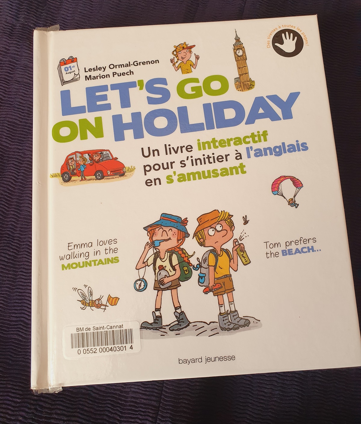 Grâce à des tirettes et des devinettes, les enfant peuvent découvrir le vocabulaire le plus couramment utilisé en vacances. Que ce soit dans une ville comme Londres, à la montagne, au camping, dans les transports comme l’avion… Ils suivent Tom et Emma en vacances et en apprennent plus aussi sur la culture anglaise.