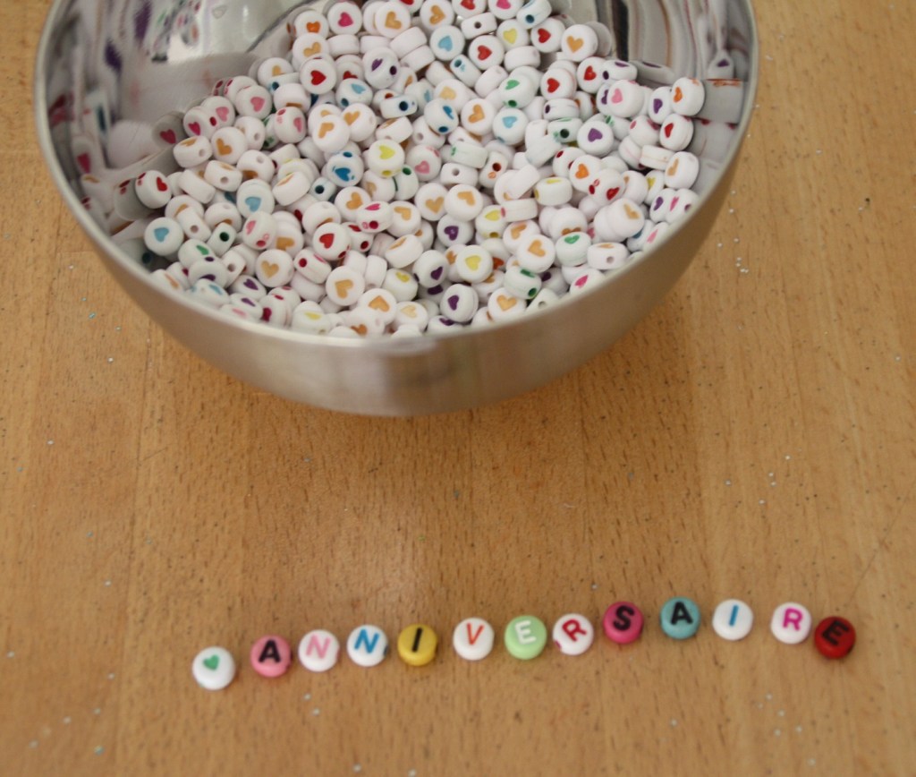 Chacune a pu repartir avec un bracelet (et parfois un collier) qu’elle avait réalisé avec des perles alphabet, coeur et perles plates heishi.
