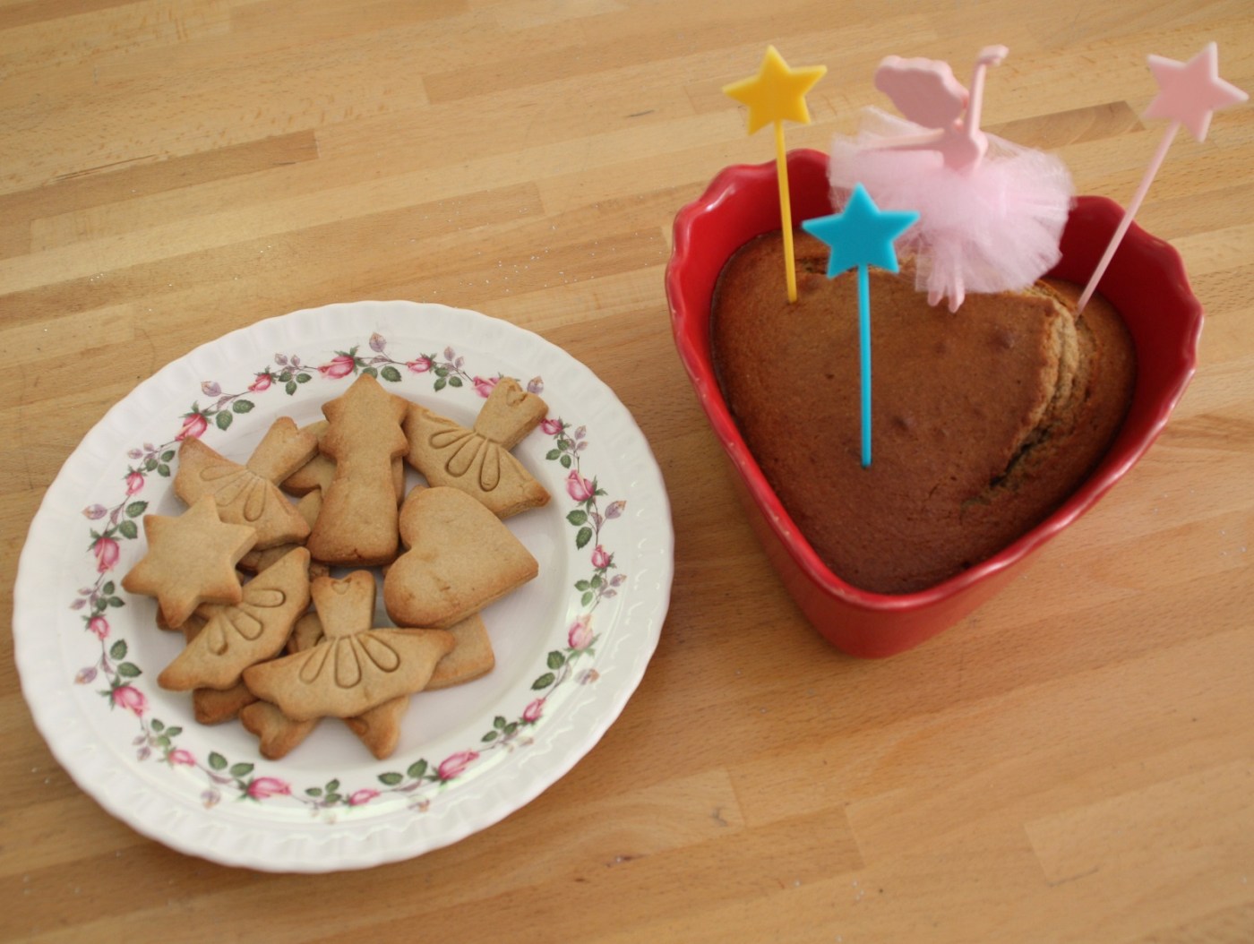 En plus d’un gâteau au chocolat en forme de papillon, il y avait au goûter des sablés en forme de tunique de danse et étoiles et un petit gâteau madeleine.