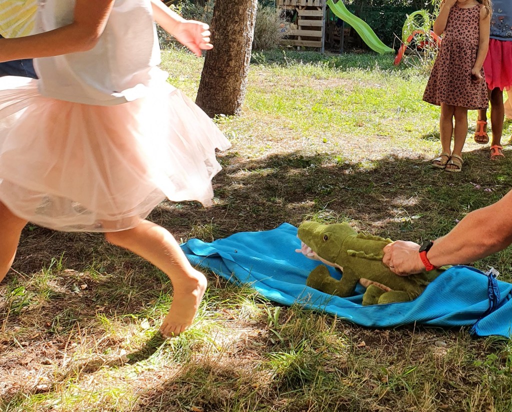 Côté animation, il y a eu un petit cours de danse animé par l’aînée. Si les positions des pieds n’ont pas eu un grand succès, les invitées se sont régalées au jeu de la statue (tu danses tant qu’il y a de la musique, mais attention à ne plus bouger quand celle-ci s’arrête). Et encore plus, avec les grands jetés à exécuter au-dessus de la rivière au crocodile.