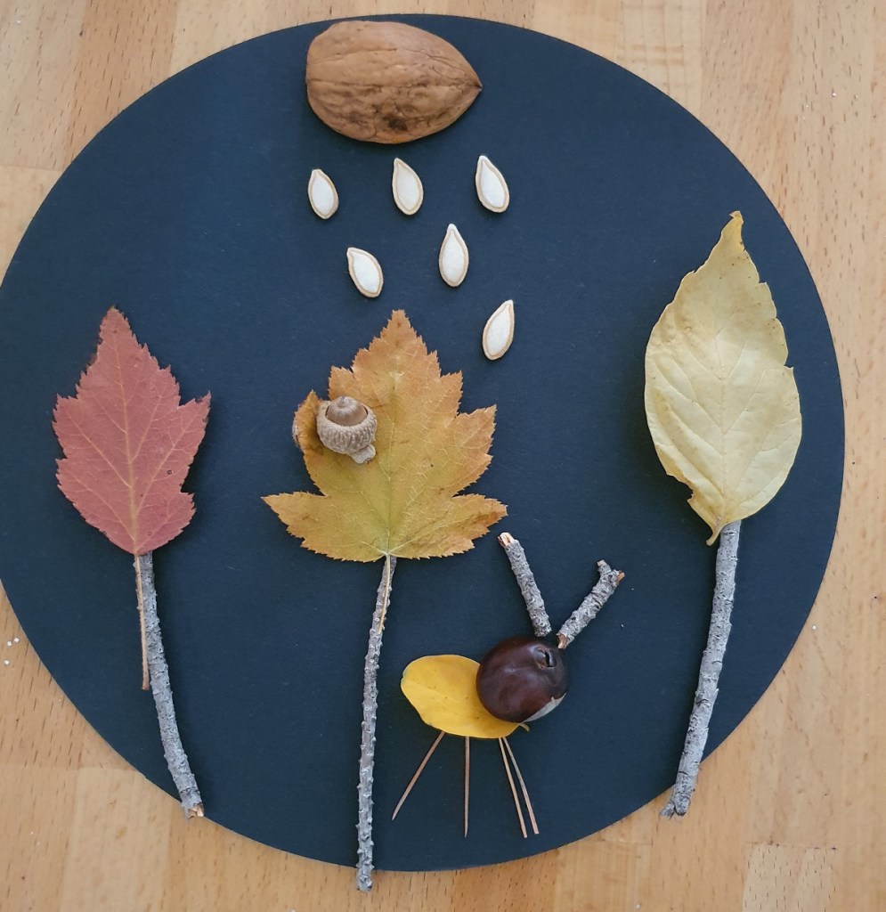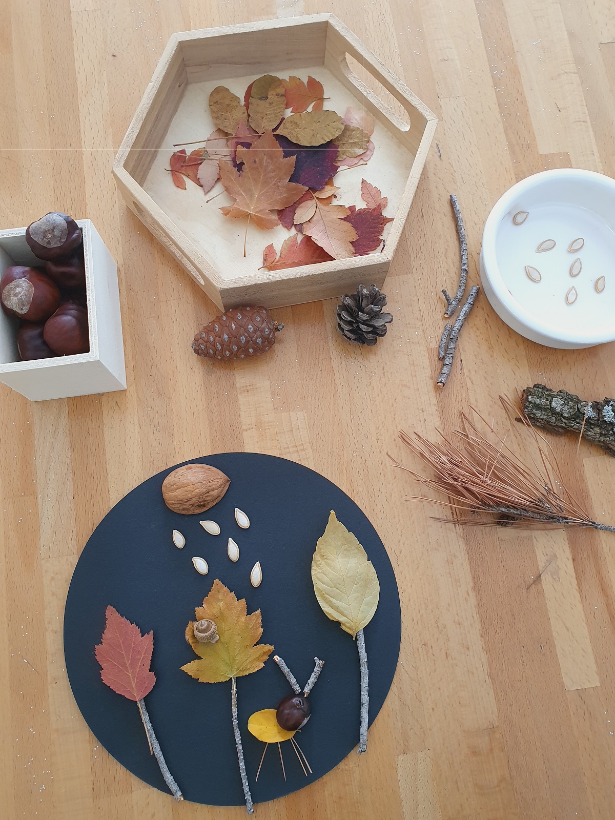 L’hiver ne débute pas avec le mois de décembre 😉 Alors, nous pouvons encore jouer avec les feuilles d’automne et autres brins de nature. Que soit les trouvailles des balades d’automne ou les cueillettes dans le jardin, nous les avons utilisées pour imaginer un paysage d’automne.