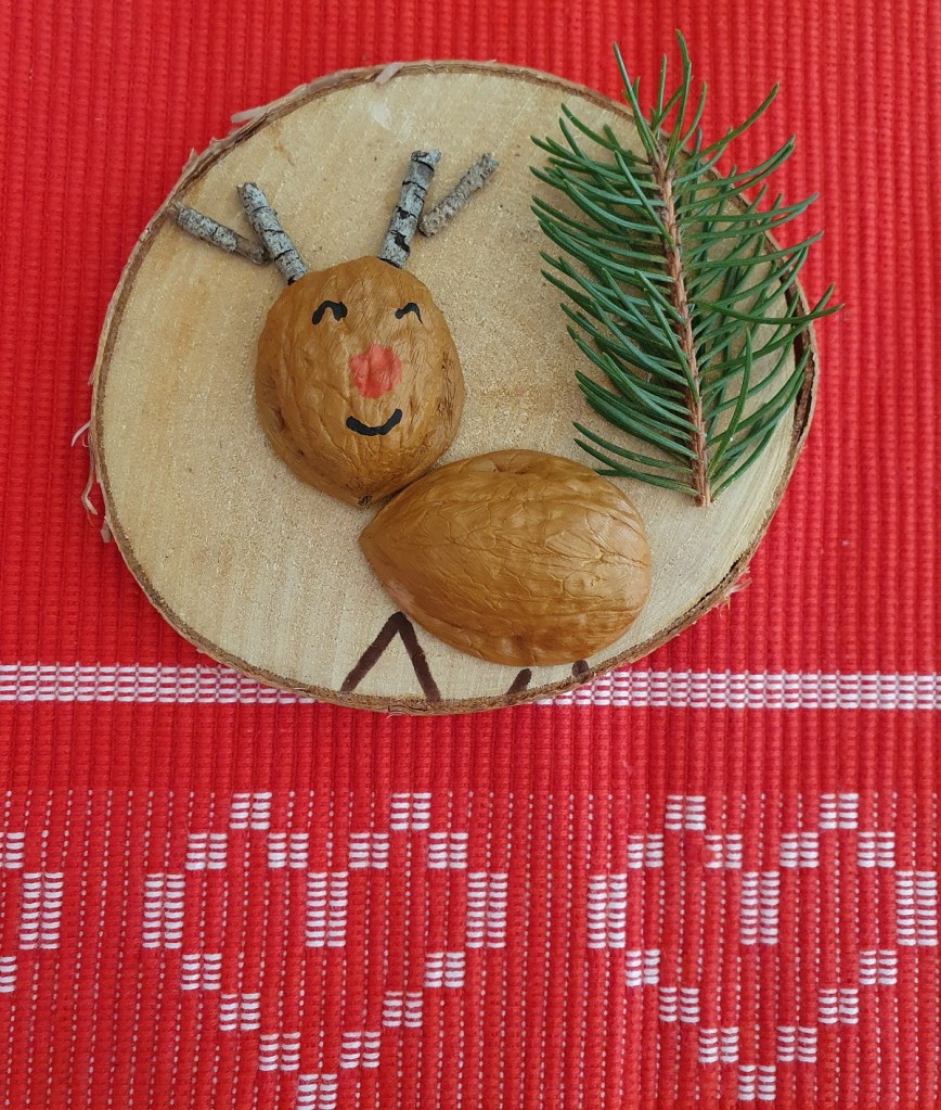Il faut aussi un peu de colle et des marqueurs multi-matériaux pour réaliser un petit renne au nez rouge. J’ai juste utilisé un peu de peinture marron clair pour peindre les deux demi coquilles de noix , lesquelles étaient un peu noires, sinon je les aurais laissées au naturel.