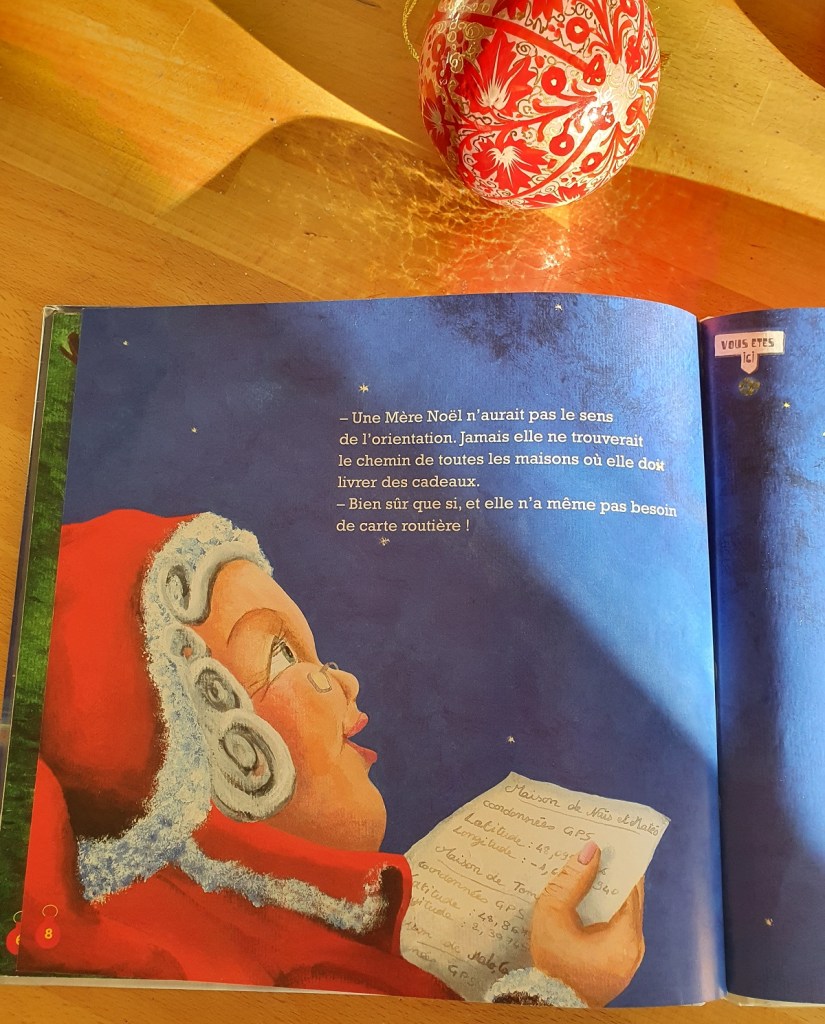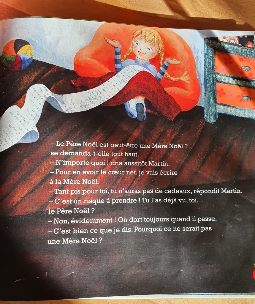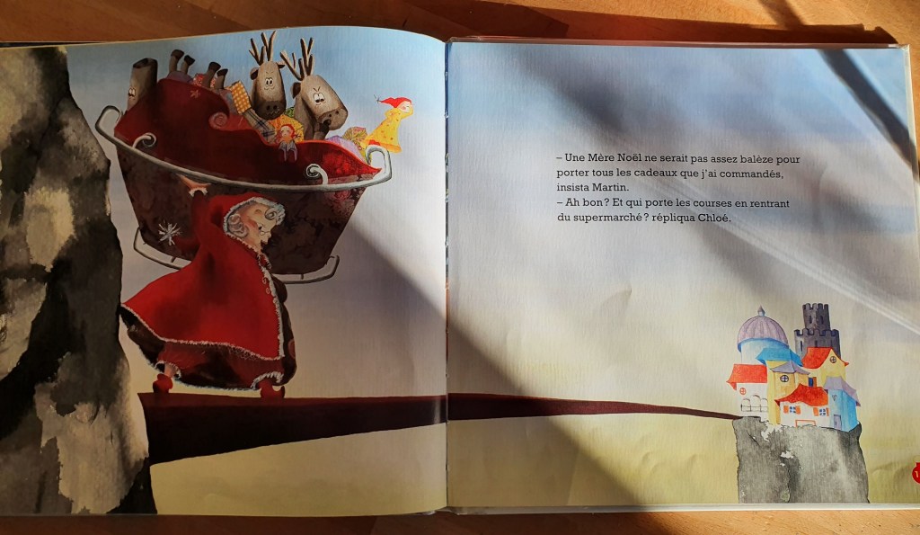 Cette petite fille décide d’écrire à la Mère Noël et non au Père Noël. Son frère a beau lui donner des arguments (non justifiés) selon lesquels une femme ne pourrait pas assurer cette fonction, Chloé sait répliquer. Elle ne saurait pas bricoler le traineau… Qui répare leurs jouets quand ils sont cassés ? Elle ne pourrait pas porter la lourde hotte de cadeaux… Qui porte les sacs en rentrant des courses ? Elle se perdrait… Là, faisons un aparté, personnellement je ne pourrais pas postuler comme Mère Noël puisque je serais incapable de retrouver le pôle Nord. Je sais bien qu’il est au Nord. Donc en haut d’une carte… enfin si elle est bien orientée Nord en haut, Sud en bas. Bref ! Mais de nombreuses femmes n’ont aucun souci d’orientation.