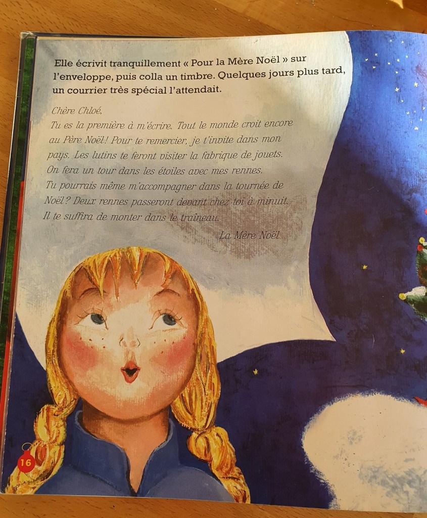 Chloé ne change pas d’avis et envoie son courrier à la Mère Noël. Qui ravie de recevoir une première lettre, l’invite à visiter la fabrique à jouets, rencontrer ses rênes et partager la tournée du 25 décembre.