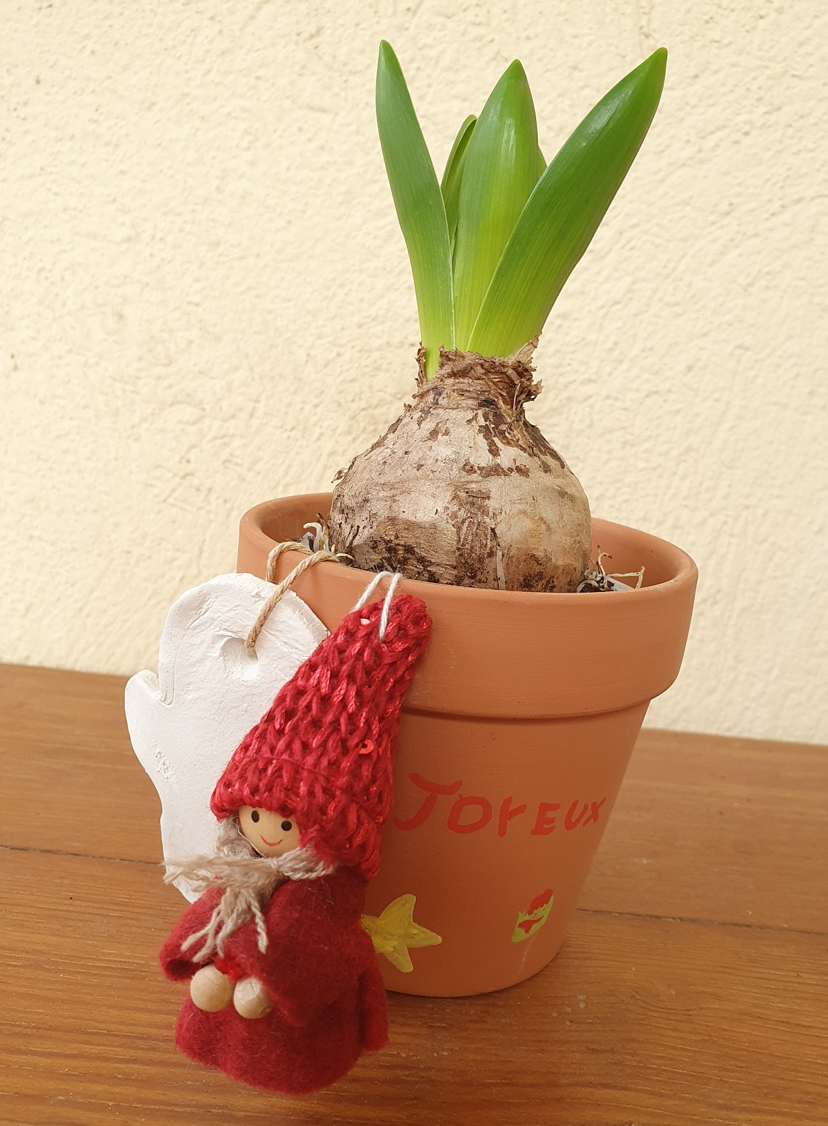 L’an dernier et cette année, nous avons donc abandonné chocolats, biscuits et compagnie, pour offrir une fleur. Cette jacinthe qui pourra décorer sa table à Noël, être replantée dans un jardin ou, à défaut, une jardinière.