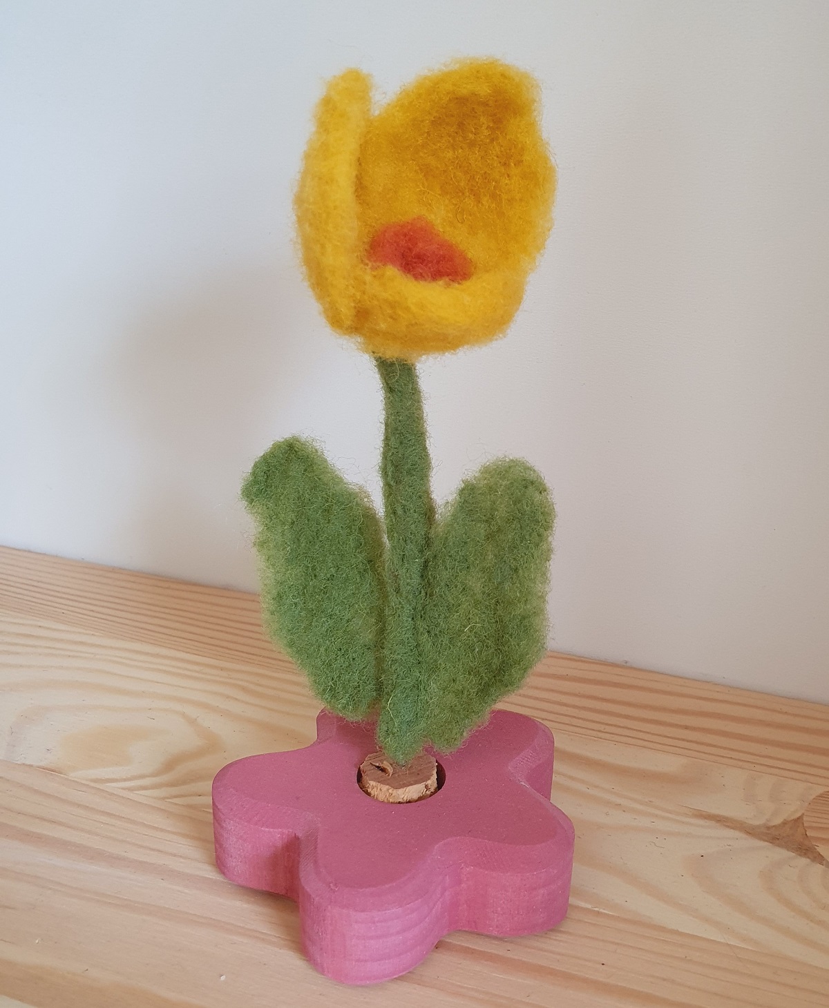 Oh, une fleur en laine ! De la laine cardée, un morceau de fil d’aluminium pour la rigidifier la tige et une rondelle de liège découpée dans un bouchon pour maintenir la fleur dans ce support en bois… et des gants de doigts en cuir pour arrêter de me piquer les doigts 😉