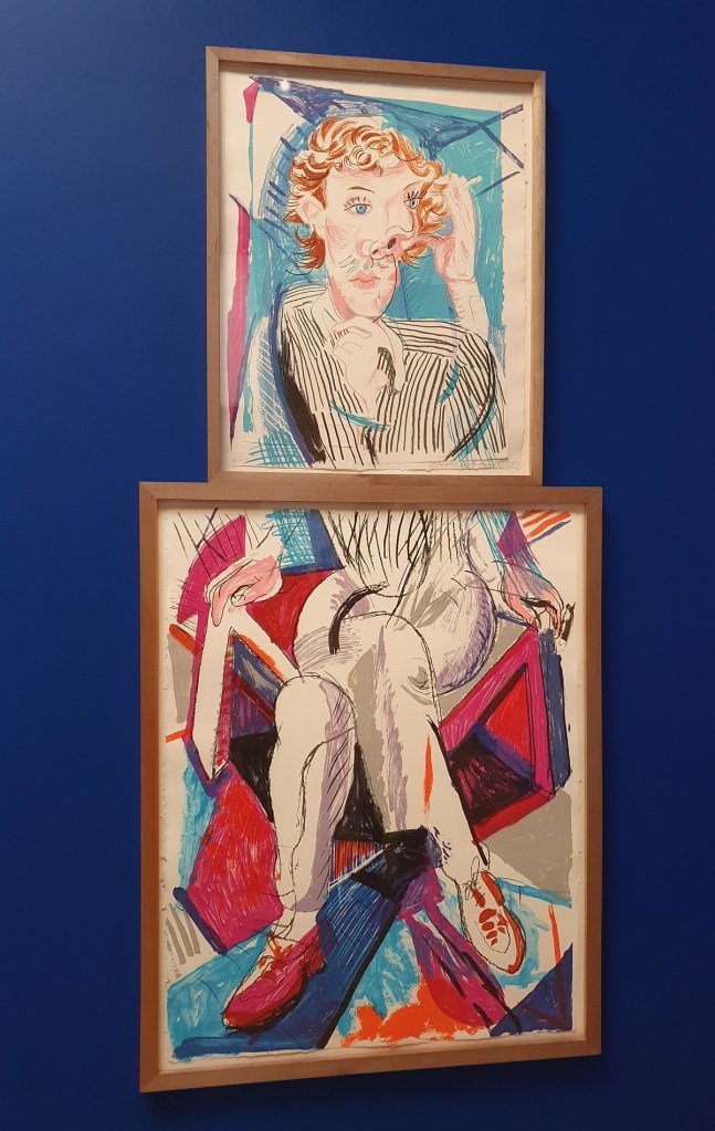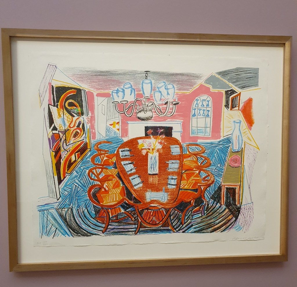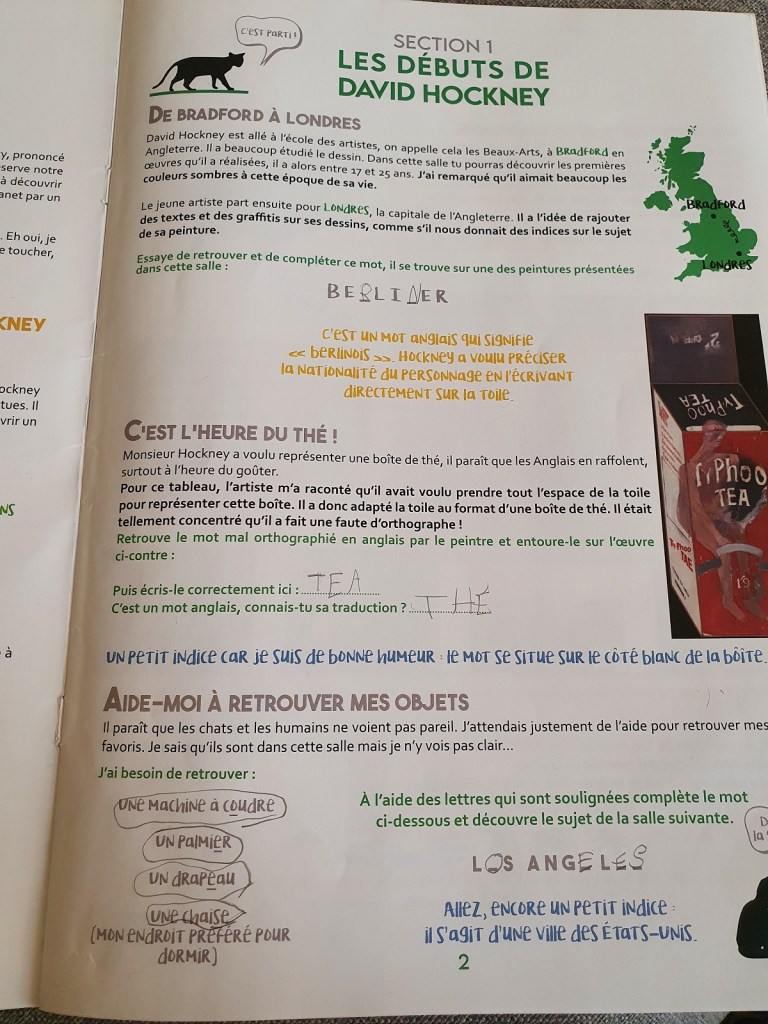 Connaissez-vous David Hockney ? Artiste britannique, exposé avant même d’avoir terminé ses études d’art, vivant entre le Royaume-Uni et les Etats-Unis. Peut-être avez-vous déjà vu un de ses tableaux avec une piscine, un portrait grand format, des dessins numériques ou des natures mortes à perspective inversée ? Je ne savais pas grand chose sur lui avant l’exposition au musée Granet et j’en ai surtout appris en lisant la biographie romancée Vie de David Hockney écrite par Catherine Cusset. Il y a bien une chronologie de la vie de l’artiste au musée, cependant elle est anti-chronologique, donc d’aujourd’hui à la naissance (à moins de prendre l’escalier à contresens). Tiens, mais je commence par les points négatifs… Il y avait trop de monde l’un des premiers dimanches de l’exposition, limite désagréable. Les enfants avaient un livre de jeux, très intéressant, mais impossible de se poser dans un coin pour prendre le temps d’observer l’oeuvre, répondre aux questions, dessiner… C’est dommage car nous avons appréciés les oeuvres présentées. Je vous laisse juger par vous-même.