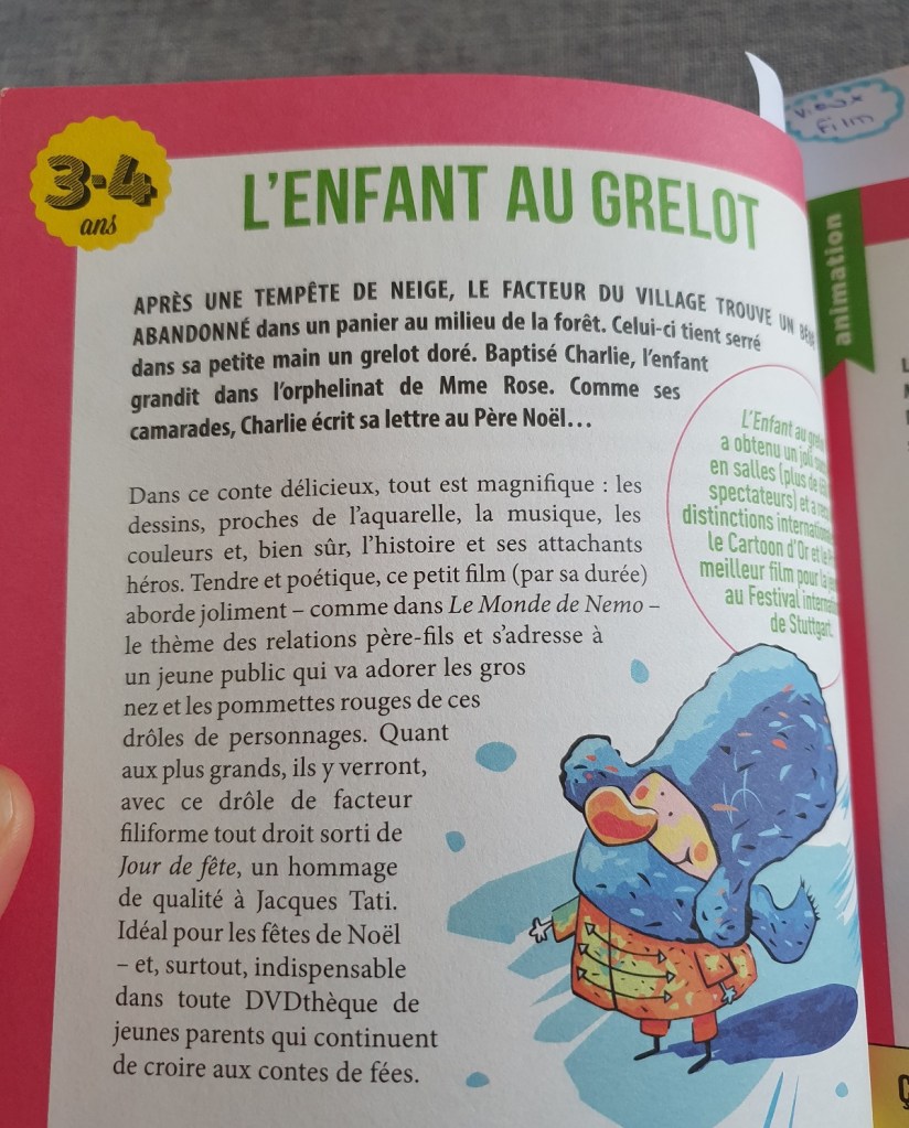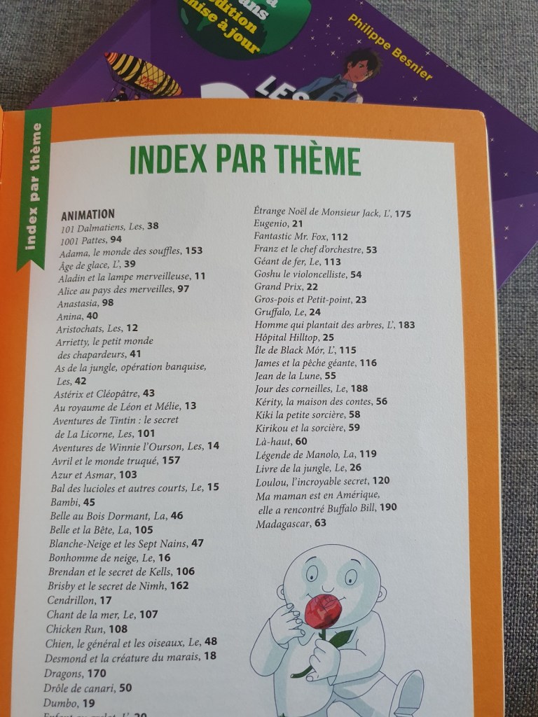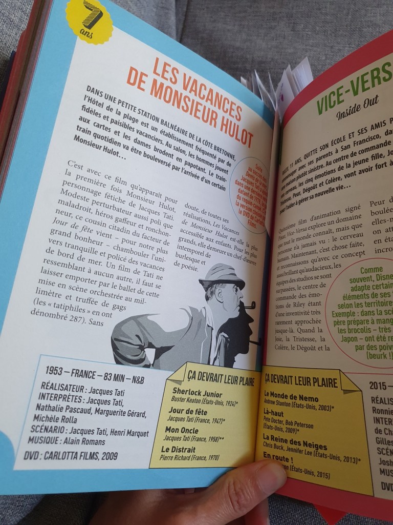 Nous avons Les 200 films à voir avant d’être presque grand (la version pour les 3 à 8 ans) et Les films à voir avant d’être grand (celle pour les 9 à 12 ans). Ces livres sont un peu comme un programme ciné familial. Mais dans un ciné où il aurait une multitude de salles, à l’horaire de son choix, et des films de toutes époques. Ils proposent aussi bien des films que des dessins animés. Les films sont classés par âge conseillé, avec un résumé, la date de sortie, la durée du film, le réalisateur… une anecdocte. Si vous aimez l’un des films, il y a une suggestion de quatre autres films similaires qui devraient aussi vous plaire, des films présentés dans un des livres ou pas. Ce qu’il fait qu’il y a en fin de compte bien plus que 400 idées de films.