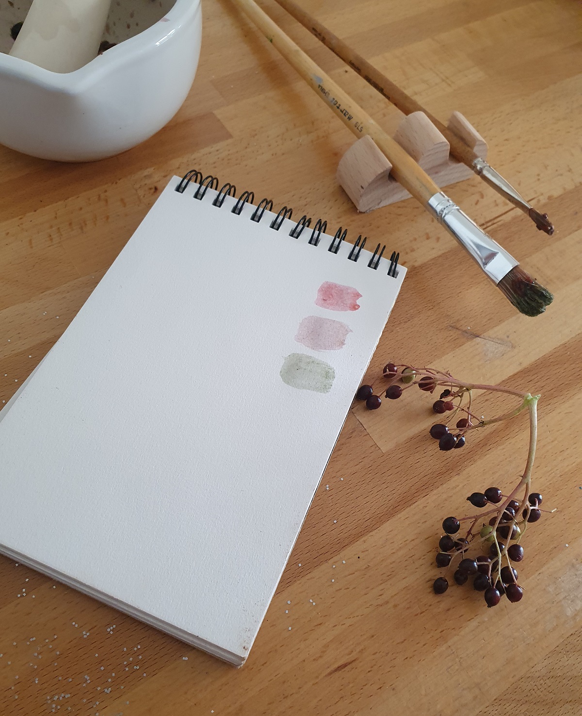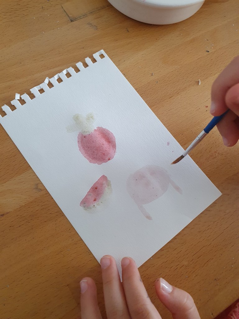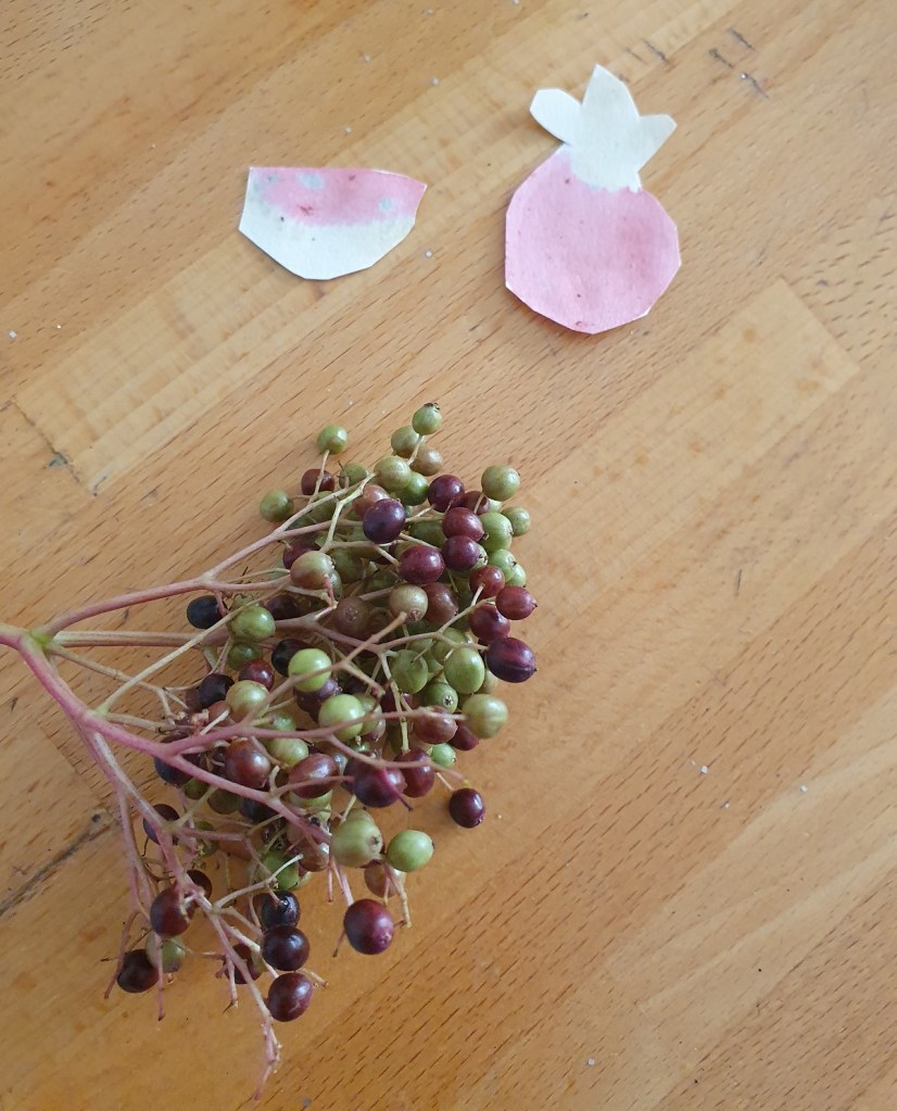 Il y a quelques temps, nous avions tenté la peinture naturelle avec du chou rouge. Cette fois-ci, nous avons cueilli de baies de sureau dans le jardin et expérimenté une palette de couleurs naturelles.