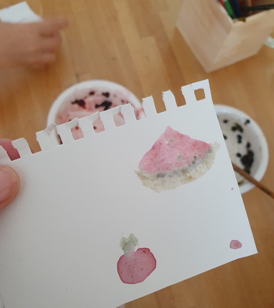 Avec ces trois couleurs, les filles ont peint des fruits. Pomme et pastèque.