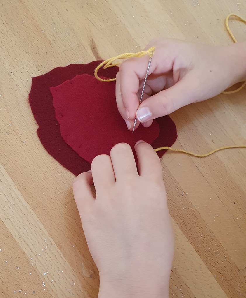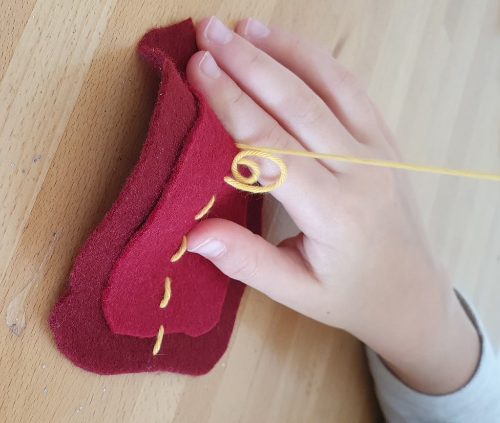 Avec la cadette (7 ans), nous avons suivi un tutoriel pour réaliser une feuille d’automne en feutrine. La liste du matériel et toutes les étapes sont décrites en détail et accompagnées de photos. C’est une co-création puis qu’elle avait seulement envie de broder. Après découpage d’après le gabarit et deux points de couture, elle a donc brodé les nervures de cette feuille. Elle a utilisé du fil à broder et une aiguille à broder en métal. Elle a déjà eu l’occasion d’utiliser de vraies aiguilles ; cependant je reste toujours à côté. Je vous propose une alternative moins « pointue » plus bas.