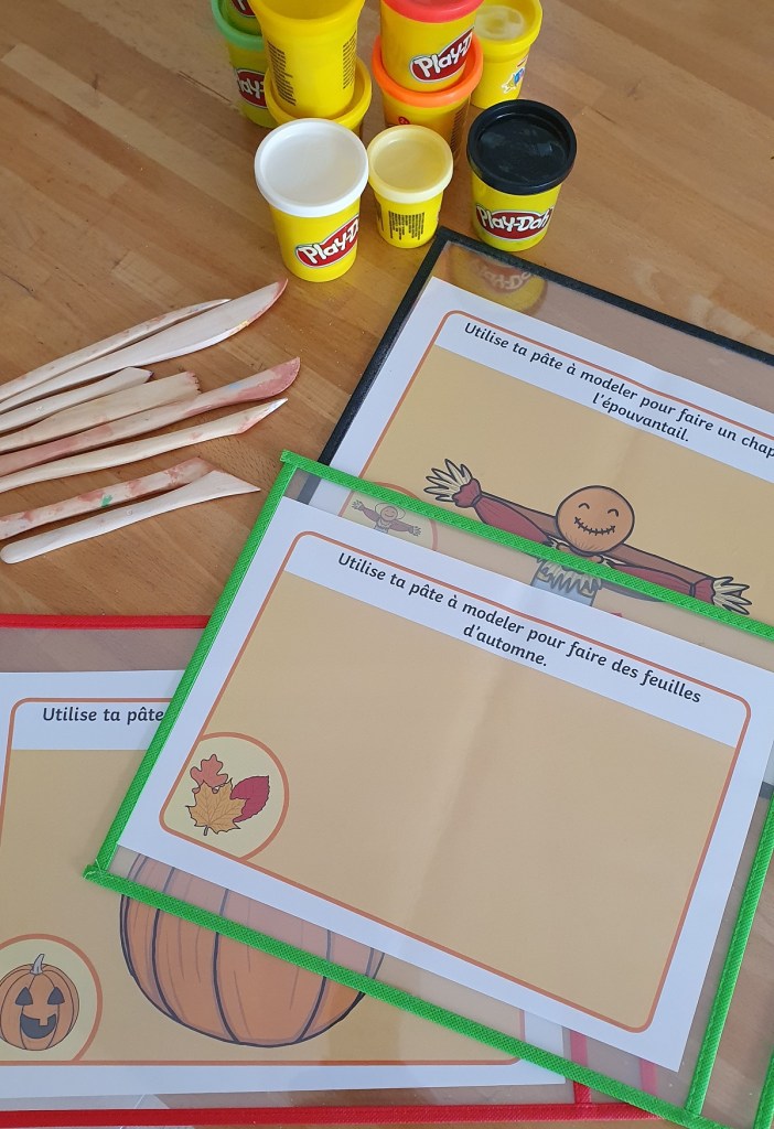 Puis, pour continuer dans la motricité fine, ma fille s’est amusée à compléter un épouvantail et une citrouille avec de la pâte à modeler. Sélectionner la couleur de pâte à modeler, la malaxer, l’étaler, la couper ou la mettre en forme avec couteau, mirette et ébauchoir ou juste avec ses mains. C’est amusant ! Et si comme moi, vous insérez les fiches du set pâte à modeler dans des pochettes plastiques, les enfants peuvent rejouer plusieurs fois dans la saison, et même l’année suivante. Sans la pochette plastique, je trouve que certaines pâtes à modeler laissent des traces de colorants sur le papier. Nous avons encore les fiches où il faut modeler des citrouilles et modeler des feuilles d’automne. Mais l’automne dure encore quelques semaines (et oui, jusqu’au 21 décembre) !