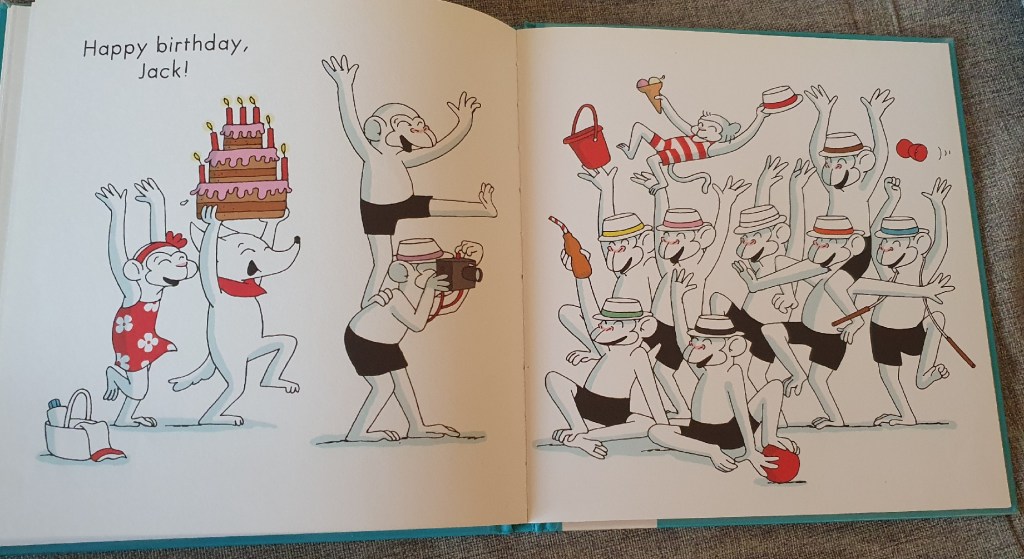 Un petit singe rencontre dix grands singes vêtus de chapeau. Le petit singe est en colère, puis triste car il n’a pas de chapeau lui… d’autant que c’est son anniversaire aujourd’hui. Alors, les grands singes lui proposent tous leur chapeau et ils partagent un grand gâteau d’anniversaire.