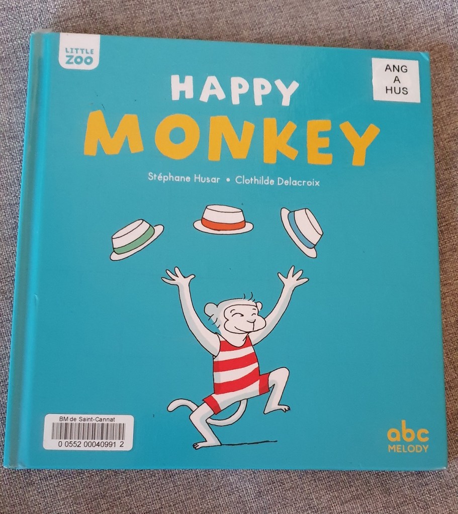 Il y a une petite étagère avec des livres en anglais ou bilingues au rayon jeunesse de la bibliothèque. J’y ai découvert la collection Little Zoo, pour les enfants à partir de 5 ans. Ce sont des histoires courtes en anglais avec peu de vocabulaire, et de nombreuses répétitions pour le retenir. Il existe 4 livres avec des animaux différents : chat, ours, pingouin (ou manchot) et puis singe. C’est celui-ci que nous avons emprunté : Happy Monkey.
