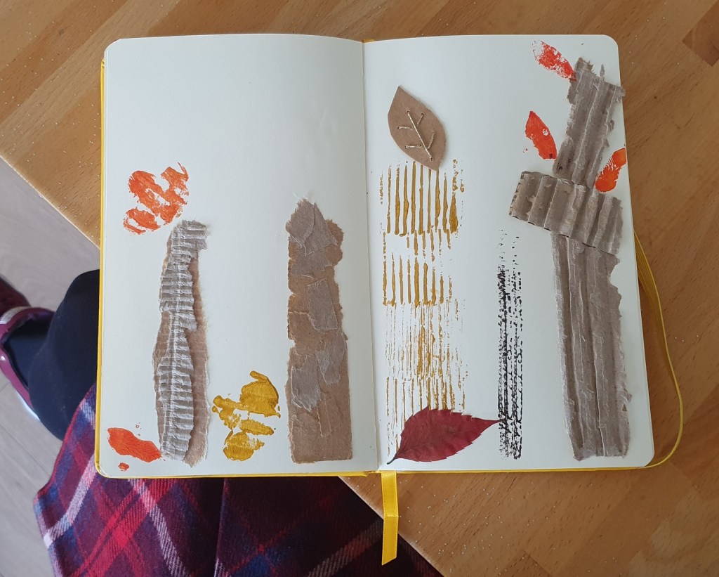 En voyant les petits morceaux de papier que j’avais arraché en voulant récupérer la partie ondulée du carton, j’ai pensé aux morceaux d’écorce d’un arbre. Et voilà comment, les morceaux de cartons sont devenus des arbres. La partie ondulée et la tranche d’un carton m’ont servi à faire des impressions de troncs supplémentaires. Des formes de feuille découpée aussi dans un carton sont devenues des tampons à utiliser avec de la peinture acrylique. Et puis, j’ai ajouté une vraie d’automne séchée et une petite feuille en carton avec nervures brodées en doré.