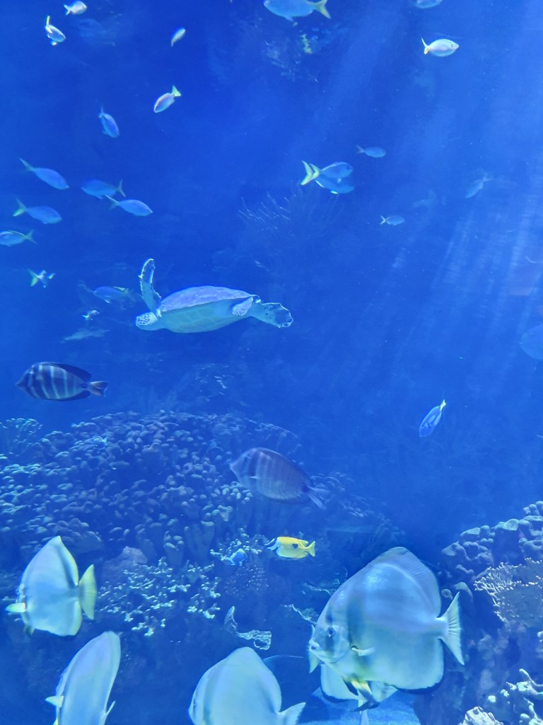 On y passe facilement la journée. Et après 16h (en ce mois d’octobre), le parc commence à se vider et seuls face aux aquariums, on a un peu l’impression de faire une plongée en pleine mer.