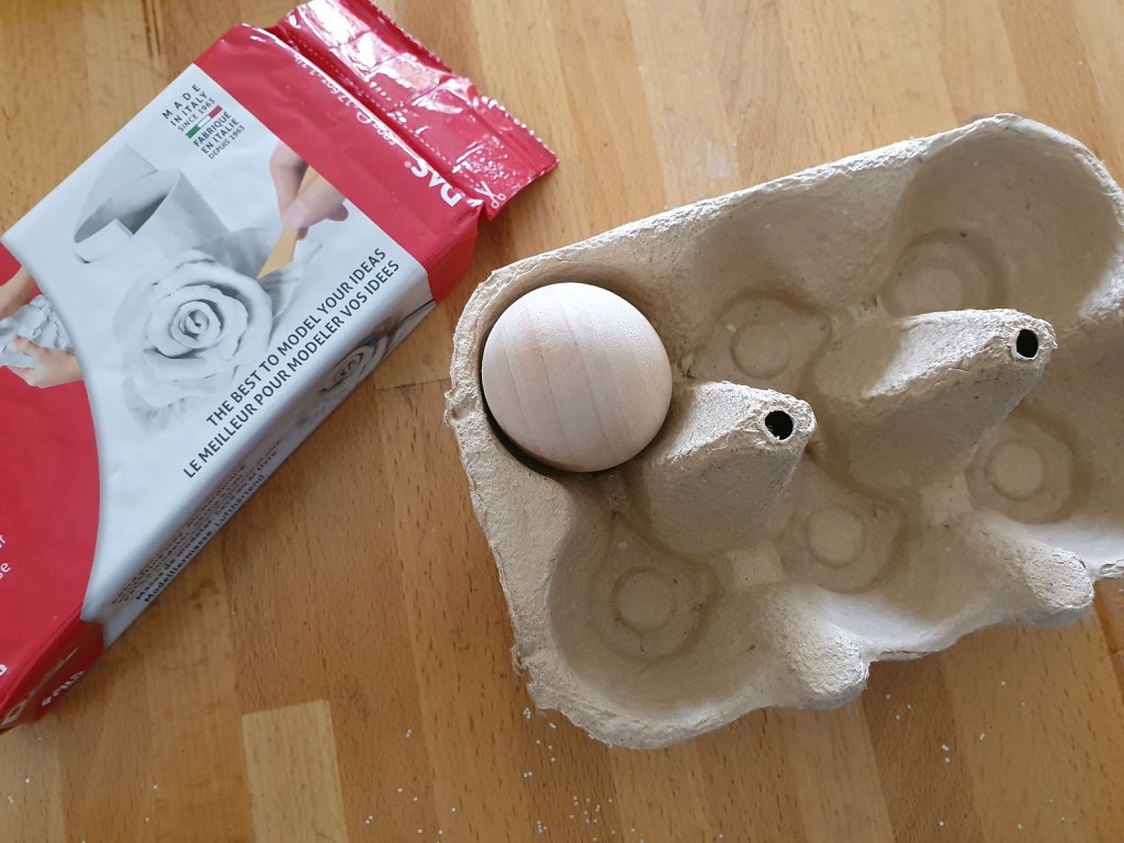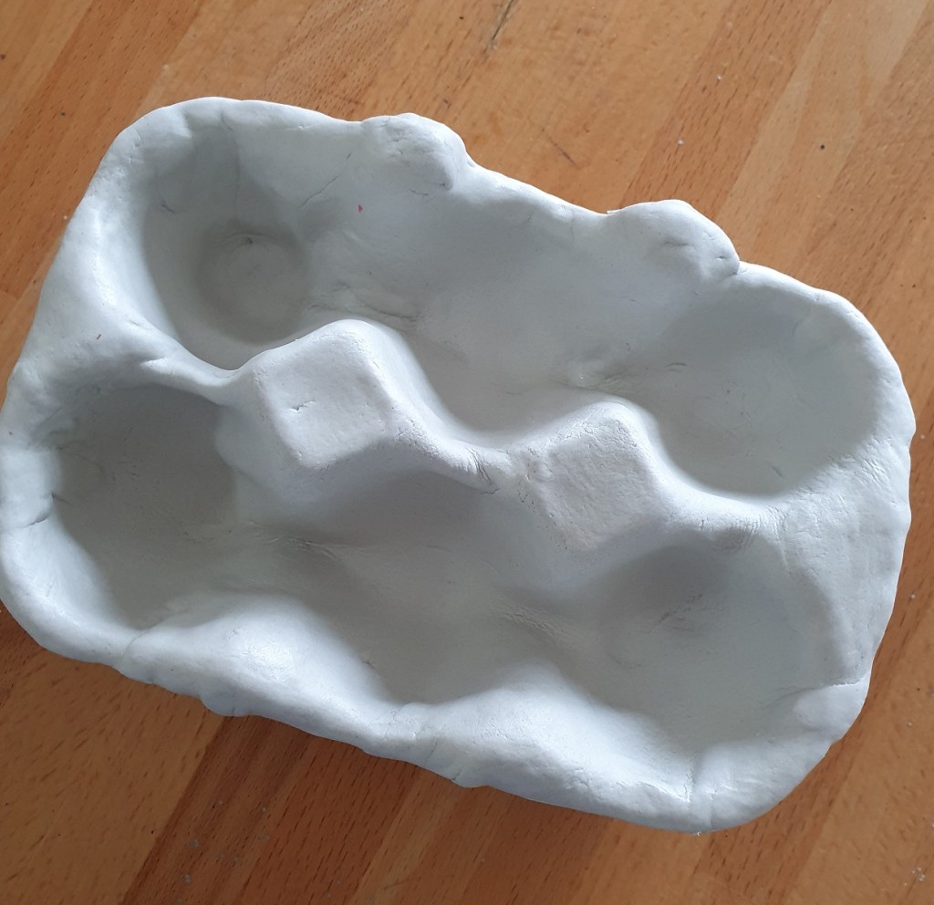 En se servant d’une boîte d’œufs comme moule, j’ai réalisé un porte-œufs en pâte autodurcissante. Après avoir étalée la pâte, je l’ai moulée délicatement (enfin, presque) à l’intérieure de la boîte. J’ai coupée la pâte en surplus sur le bord. Après quelques jours de séchage, un démoulage et un peu de ponçage pour les bords, j’ai ajouté quelques pois de peinture et j’ai vernis le tout. C’est exclusivement pour la décoration, le vernis n’est pas adapté pour le contact alimentaire.