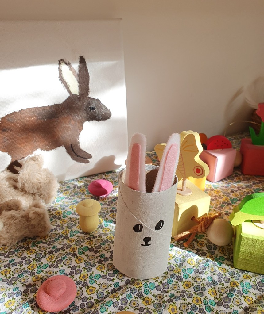 La cadette a transformé un simple rouleau de papier toilette en lapin. Il a fallu un peu de peinture, un marqueur, de la feutrine, un peu de pâte autodurcissante (pour faire la queue du lapin, que l’on ne voit pas bien sur les photos) et de la colle.