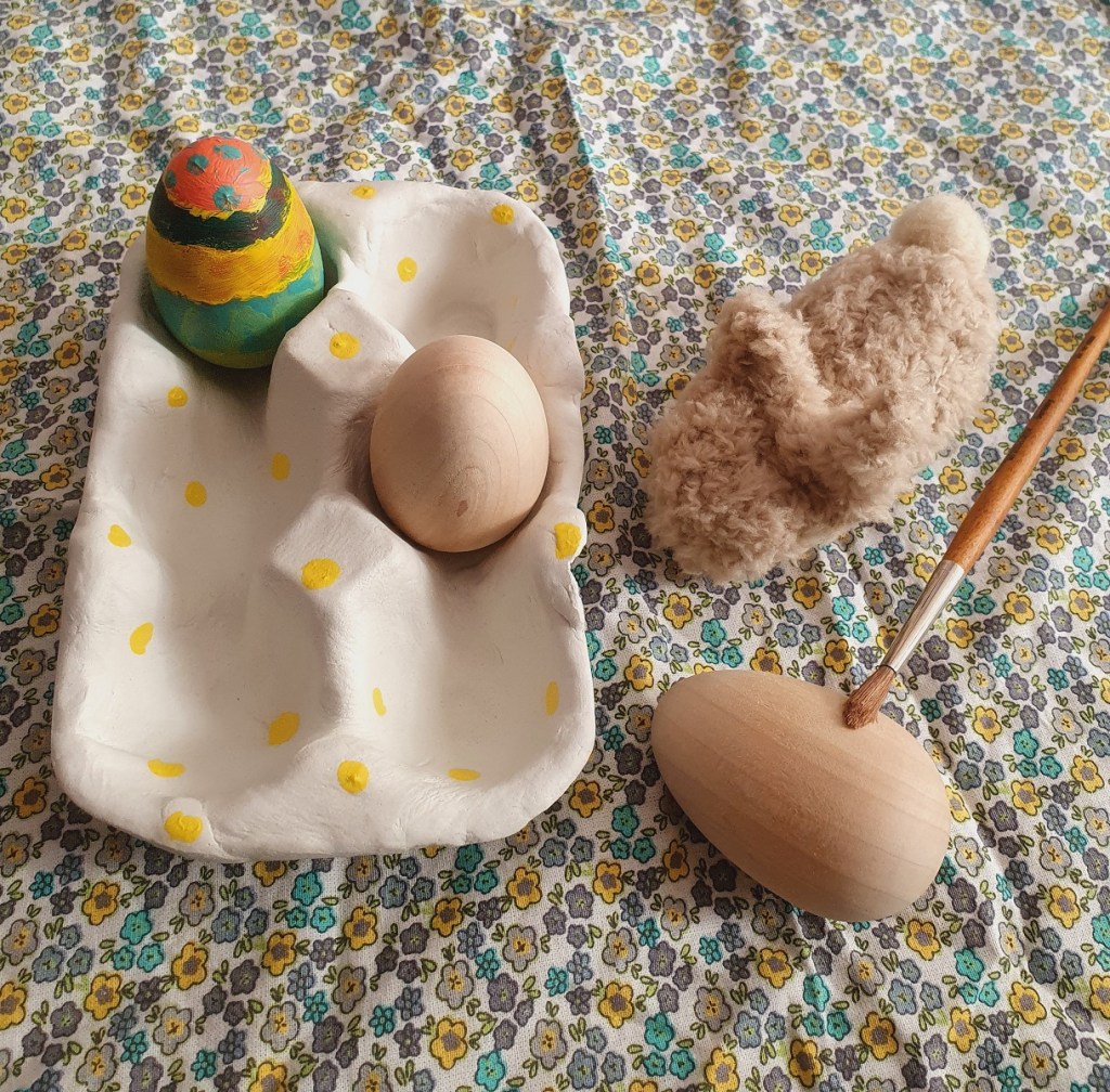 Pour l’instant, il n’y en a qu’un de décoré… mais il nous reste quelques jours avant Pâques. C’est un œuf en bois que la cadette peint à la peinture acrylique.