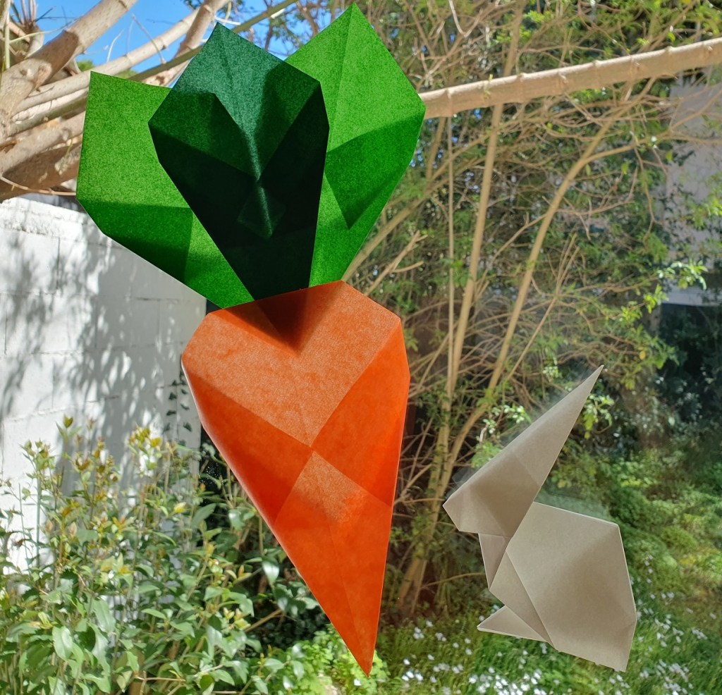 J’ai eu le compas dans l’oeil pour les proportions, non ? Voici donc le bébé lapin nain et la variété de carotte géante. Ce sont des pliages réalisés avec du papier de soie. J’ai trouvé le tutoriel pour la carotte ici, et celui pour le lapin là.