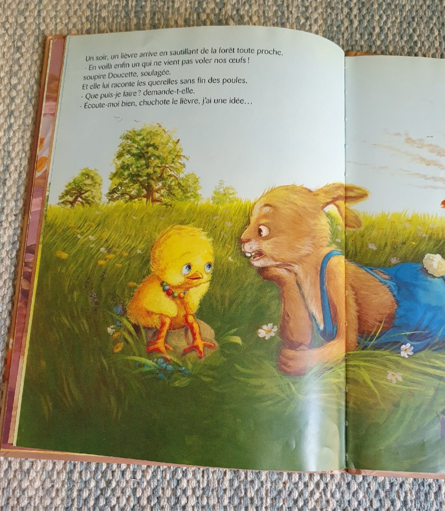 Il existe plusieurs légendes sur les oeufs de Pâques. Parmi elles, il y a celle de Doucette. Elle née dans un poulailler où les poules se chamaillent pour savoir si ce sont les oeufs blancs ou les bruns qui sont les plus beaux. Elles se disputent tellement, qu’elles s’aperçoivent à peine de la naissance de Doucette, mais surtout, elles laissent le champ libre aux belettes, renards, et autres amateurs d’oeufs. Heureusement, le lièvre n’est pas l’un de ces pilleurs d’oeufs et donne une idée à Doucette. Toute la nuit, elle décore les oeufs avec une multitude de couleurs. Les poules, au départ, ne sont pas ravies : « Je rêve ou quoi ? Cette idiote a barbouillé nos oeufs si précieux ! ». Et surtout, on se sait plus distinguer les oeufs bruns des blancs. Mais le fermier se dit que ses clients vont adorer ces oeufs pour Pâques. Alors depuis, Doucette peint les oeufs et le lièvre les porte aux clients 😉