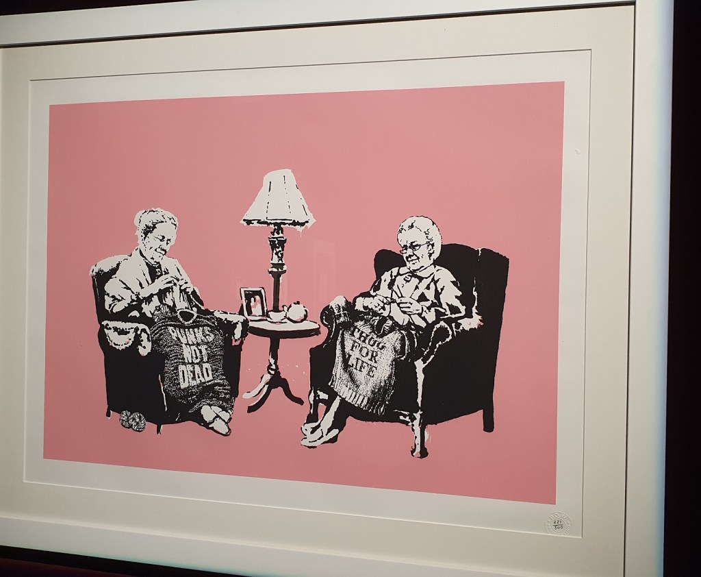 Bref, l’exposition A Vandal Turned Idol était intéressante. Organisée par thèmes chers à l’artiste : société de consommation, pouvoir, guerre… Et se terminait par quelques minutes de balade virtuelle (avec un casque de réalité virtuelle) dans les rues de Londres, Paris, New York… pour découvrir ses principales oeuvres.