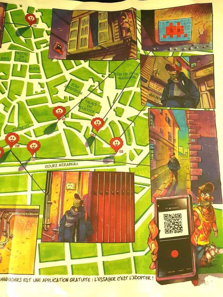 De nombreux space invaders décorent des murs des bâtiments aixois. Dans le cadre des Rencontres du 9e art, Nicolas Kéramidas a imaginé une courte bande dessinée avec un plan pour partir à leur recherche. Nous avons ainsi découvert l’existence de plusieurs space invaders (petites mosaïques en forme de vaisseaux extraterrestres réalisées par l’artiste Invader) et d’une application pour flasher nos découvertes.