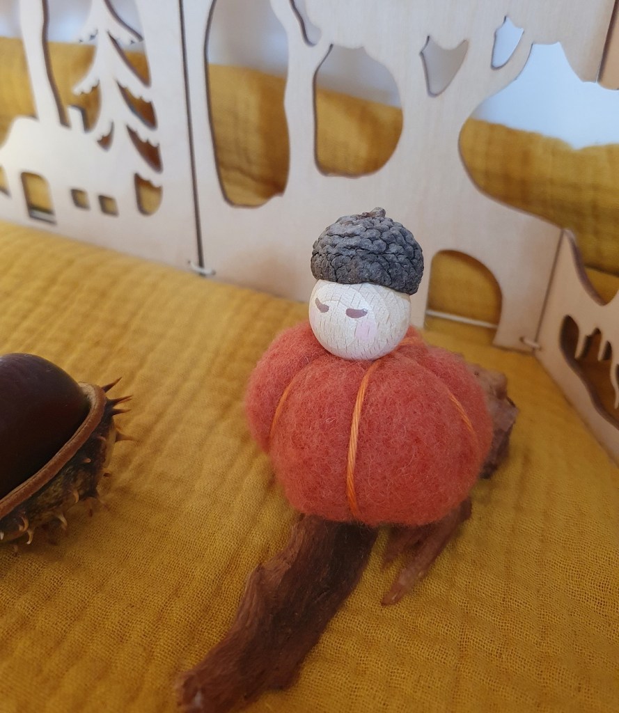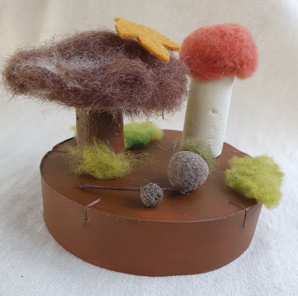 - De la laine à feutrer orange, marron, beige, verte olive et verte mousse (pour les champignons, la mousse et le gland)