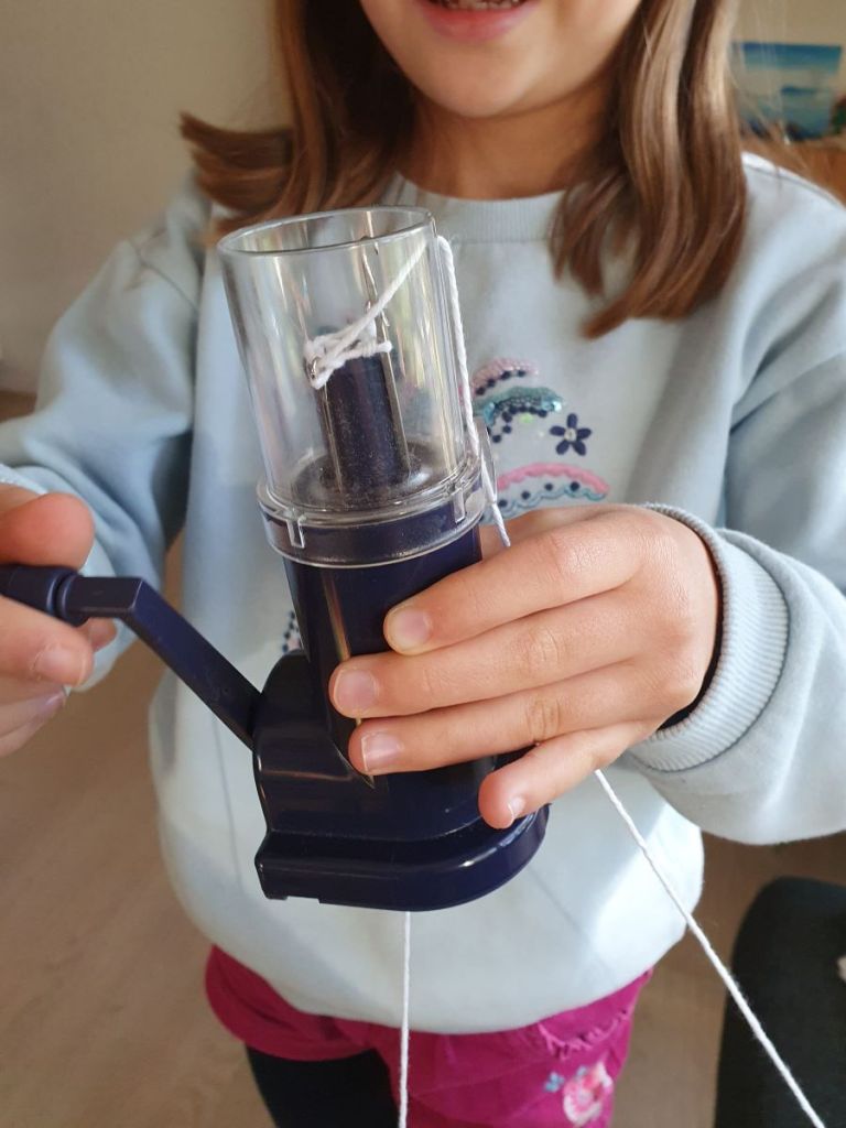 Quelques tours de tricotin avec de la laine ou du fil de coton blanc, puis rouge. Du fil d’aluminim pour la forme et quelques points de couture. Voici le sucre d’orge.