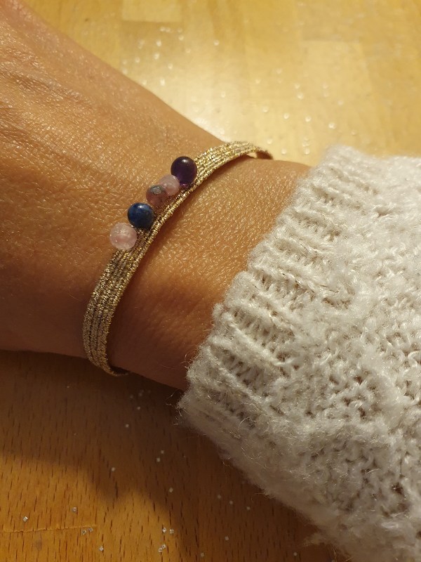 Bonne année ! Je ne sais plus dans quelle boutique ai-je vu un bracelet qui semblait fait d’un ruban doré décoré de quelques pierres. Les couleurs ne me convenant pas, j’ai décidé d’en créer un similaire. Si, au départ, je pense utiliser un ruban ou un galon, j’ai finalement opté pour un morceau d’élastique doré,... Lire la Suite →
