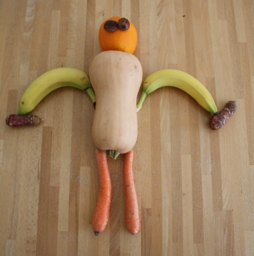 Dans de nombreuses classes de maternelles, chaque mois les enfants dessinent un bonhomme... pour voir l'évolution. Et si nous faisions des bonhommes sans crayon, ni feutre. Voici notre premier bonhomme... en fruits et légumes. Et plein d'autres suivront !