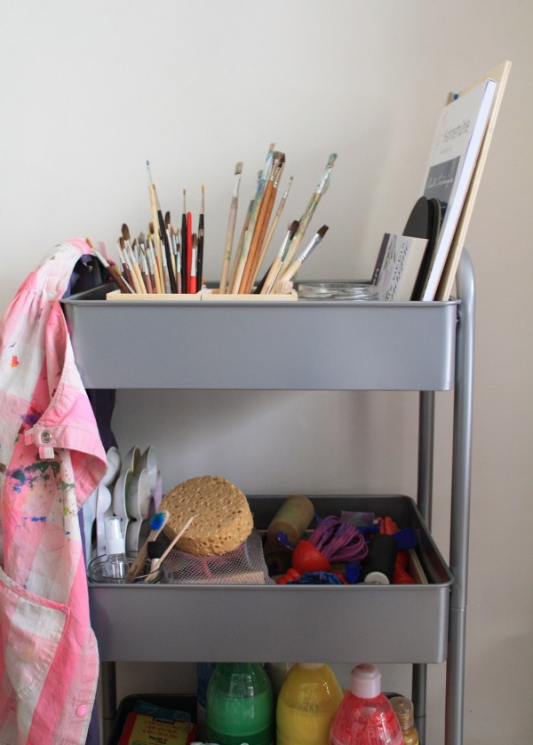 Avant, il y avait la gouache d’un côté, l’aquarelle de l’autre, les pinceaux entourés d’un élastique, les rouleaux dans une boite, le papier et les tabliers dans un placard… Maintenant tout est regroupé dans un chariot à roulettes, pour tout avoir à disposition quand nous peignons dedans ou dans le jardin. Des pots à crayons... Lire la Suite →